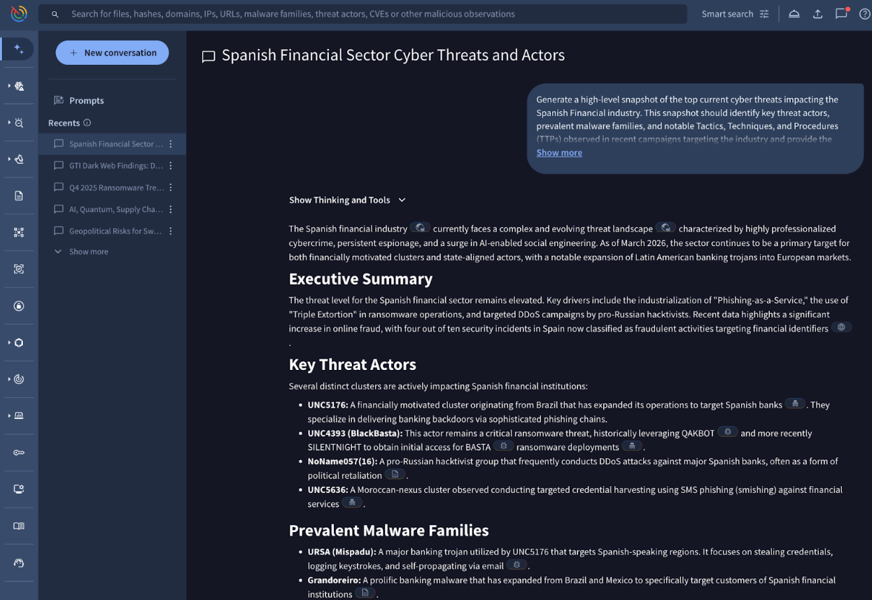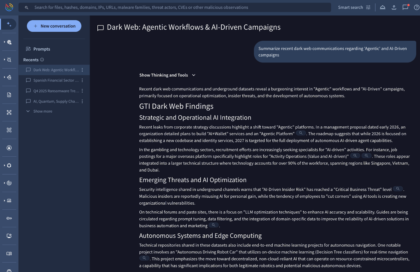 By integrating the Dark Web dataset into Agentic, now users are allowed to query Google Threat Intelligence’s vast archives of deep and dark web content, including forum posts, messaging services like Telegram, paste sites, and illicit marketplaces, using natural language.