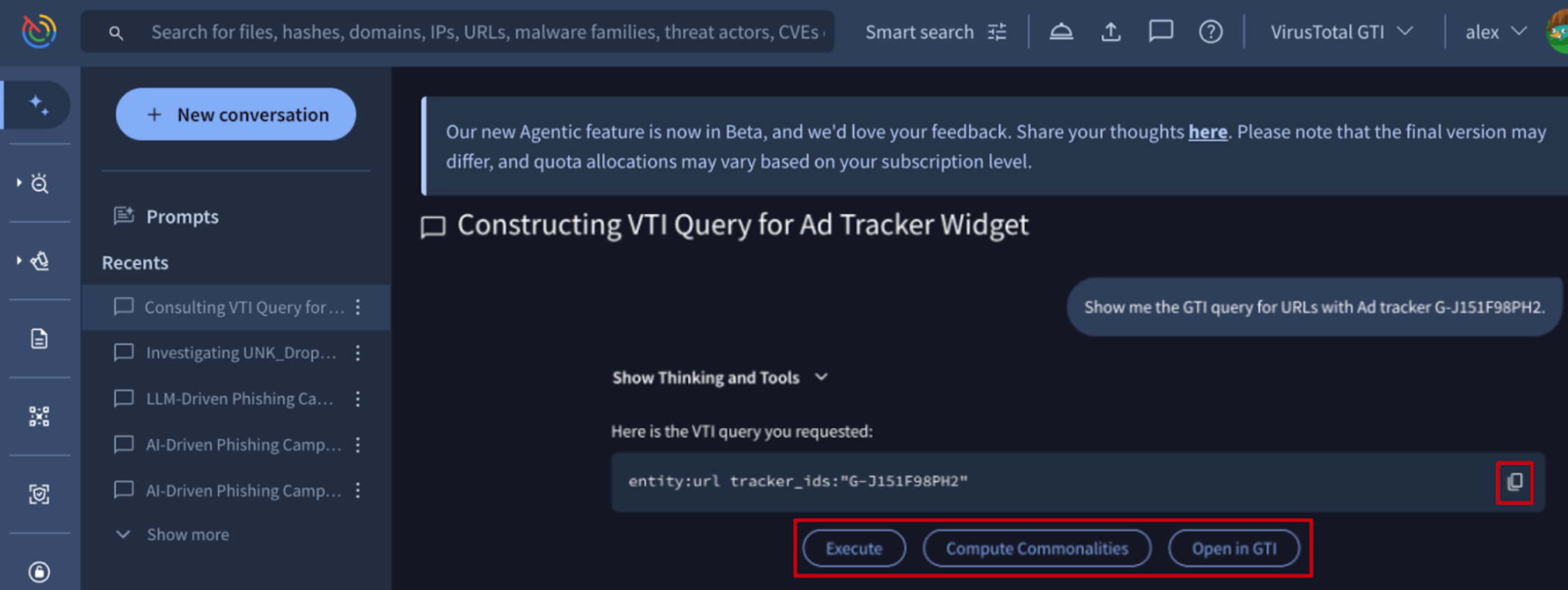 🆕 Agentic can now construct intelligence searches / queries. Agentic is the AI-powered assistant within GTI, designed to simplify and streamline complex threat intelligence tasks. Users can now leverage natural language to automatically generate complex intelligence searches / queries for IoCs (files, URLs, domains, IP addresses). This new capability eliminates the previous requirement for analysts to manually consult and apply a wide array of search modifiers, significantly speeding up IoC investigation and improving search accuracy. Additionally, the tool allows users to: