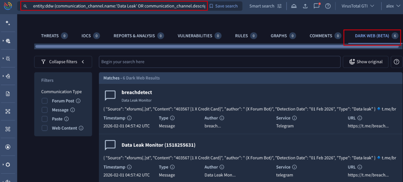 🆕 Advanced Search Support for Dark Web Entities. The Dark Web module within Google Threat Intelligence provides deep visibility into encrypted and unindexed layers of the web, including underground forums, messaging channels (like Telegram), paste sites, and onion-hosted marketplaces. It normalizes illicit data into actionable intelligence, allowing security teams to monitor environments where cybercriminals trade credentials, leak data, and plan attacks.