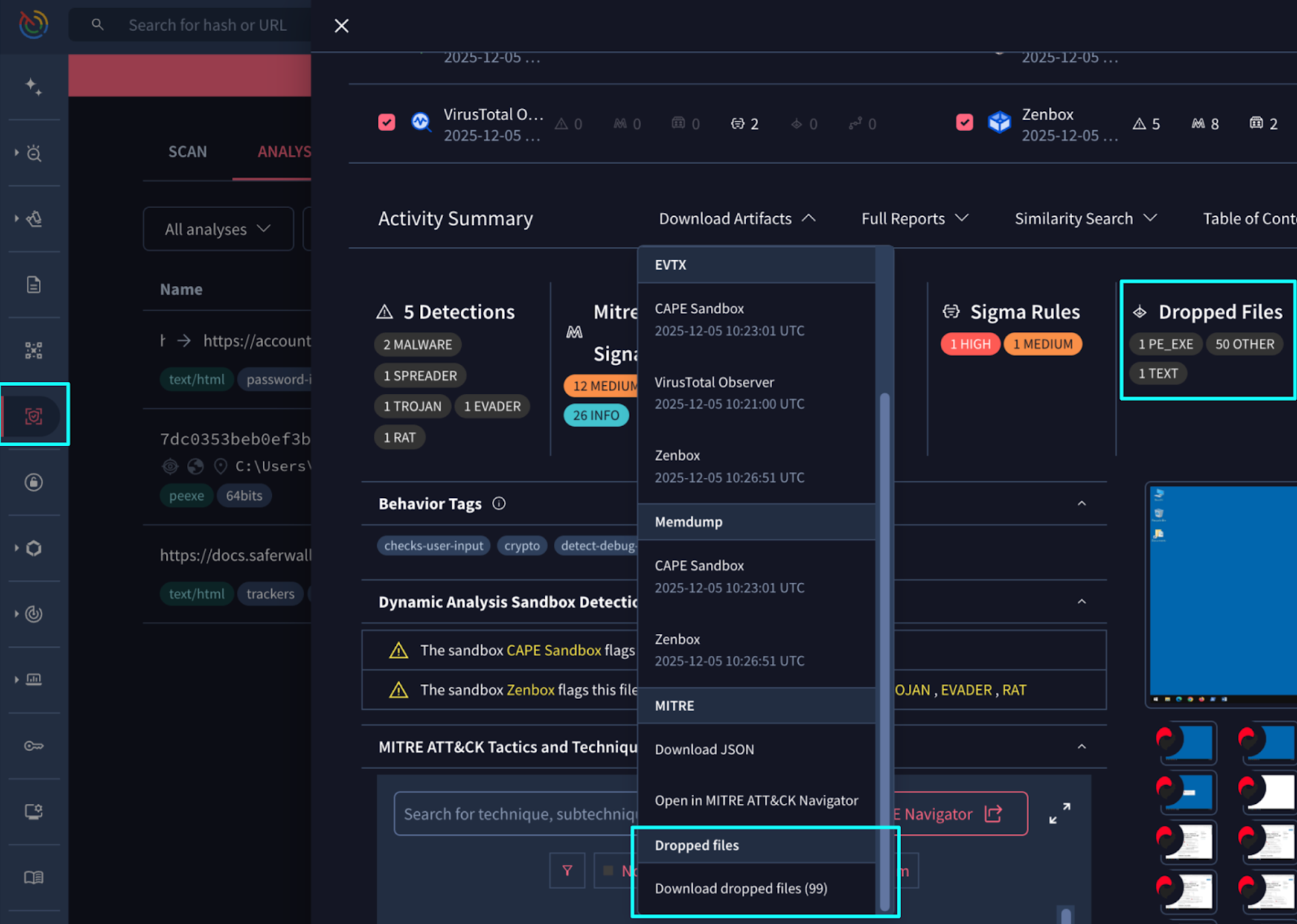 🆕 Download Dropped Files from Private Sandboxes. Our Private Scanning service captures the complete runtime profile of analyzed files. By executing samples in multiple private sandboxes, we record all dropped files, network traffic, and system modifications, which are detailed in the BEHAVIOUR tab of each file analysis report. You can now download a single, aggregated ZIP file containing all dropped files generated during a private dynamic analysis execution. This new functionality simplifies the transition from our platform to a local, isolated environment for deeper, hands-on forensic investigation of related artifacts.