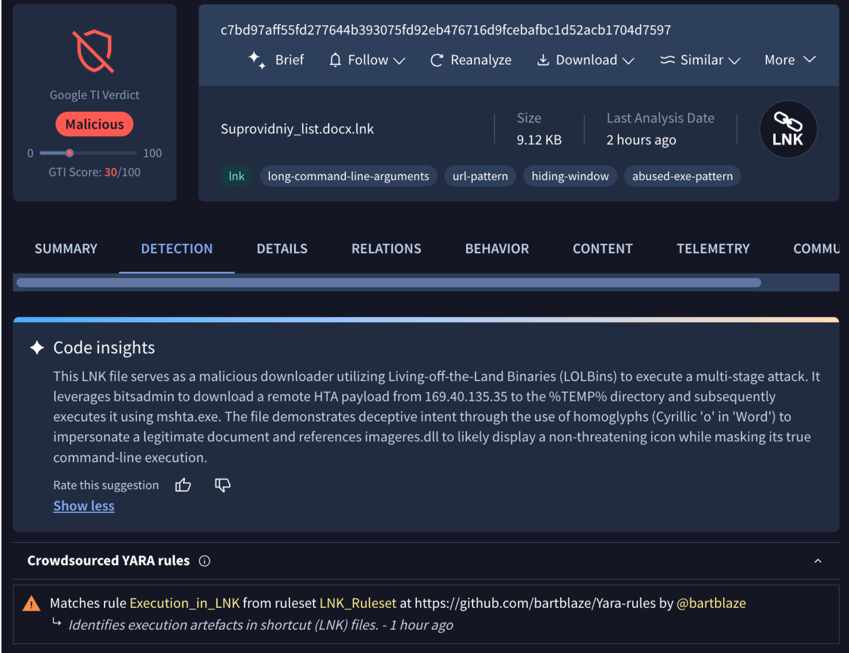 💪 Code Insight Support for LNK Files. Code Insight is an advanced, Gemini AI-driven capability within Google Threat Intelligence that serves as an automated assistant for malware analysts and reverse engineers. It leverages artificial intelligence to generate natural language summaries that clearly describe a file's true intent and overall functionality.