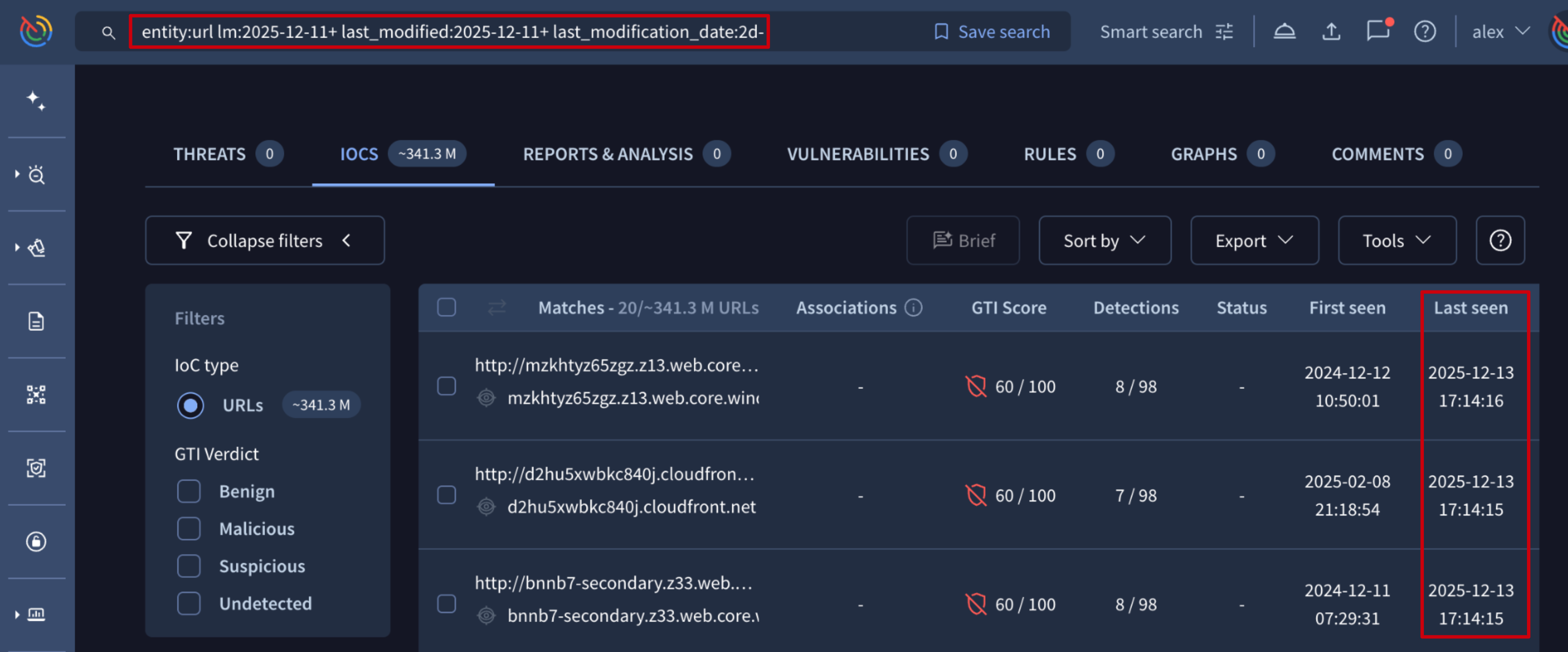 🆕 New URL search modifiers. The Intelligence Search feature allows users to execute complex and powerful queries against our expansive dataset of malicious indicators, enabling threat hunters to uncover infrastructure, track campaigns, and identify evolving threats. We have introduced three new search modifiers for URL entities: last_modified, last_modification_date, and lm. These modifiers allow analysts to filter URL indicators based on the exact time they were last updated in our database.