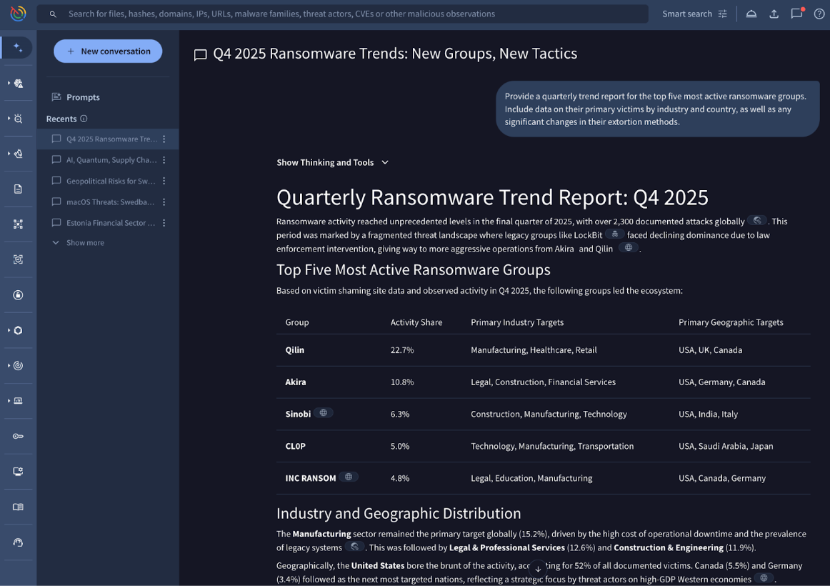💪 Ransomware DLS Activity now integrated into Agentic. Now that we have integrated the Ransomware Data Leaks dashboard and Agentic tool, users can query live extortion trends, victimology data, and ransomware group activities through natural language prompts instead of manual dashboard filtering.
