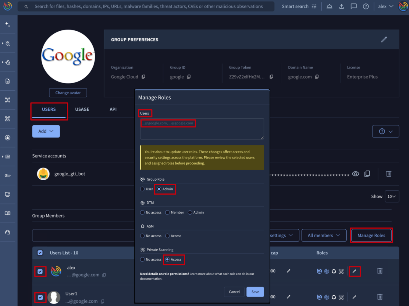 🔄 Bulk User Management for Group Administrators. The Group Management suite within the Google Threat Intelligence platform allows administrators to oversee their organization’s users, service accounts, features allowance and consumption and all group settings. It provides a centralized interface (and API) to control who has access to the platform and what specific modules they can interact with.
