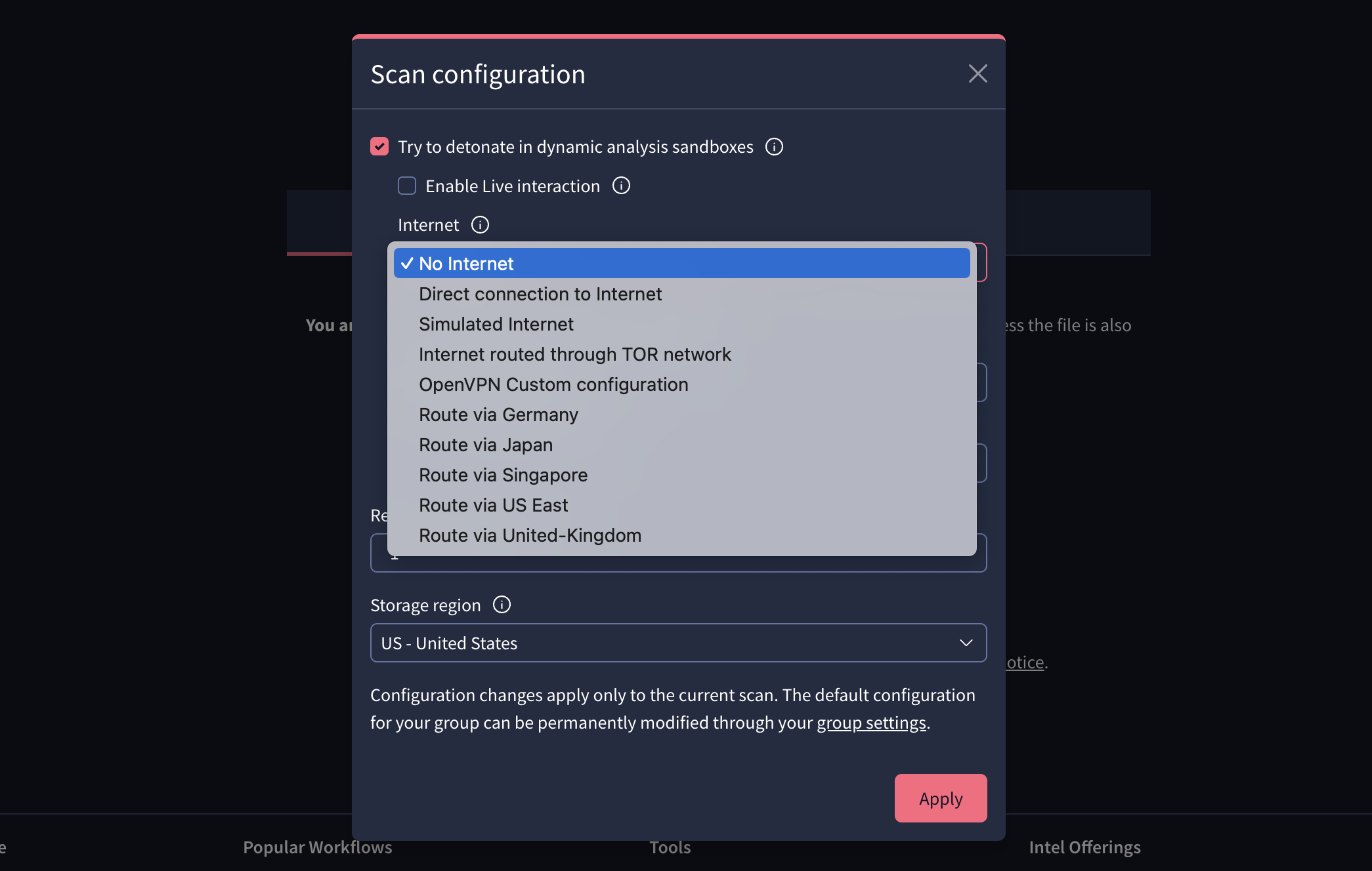 Remember that you can choose between static analysis only or static and dynamic detonation via the "Try to detonate in dynamic analysis sandboxes" checkbox.