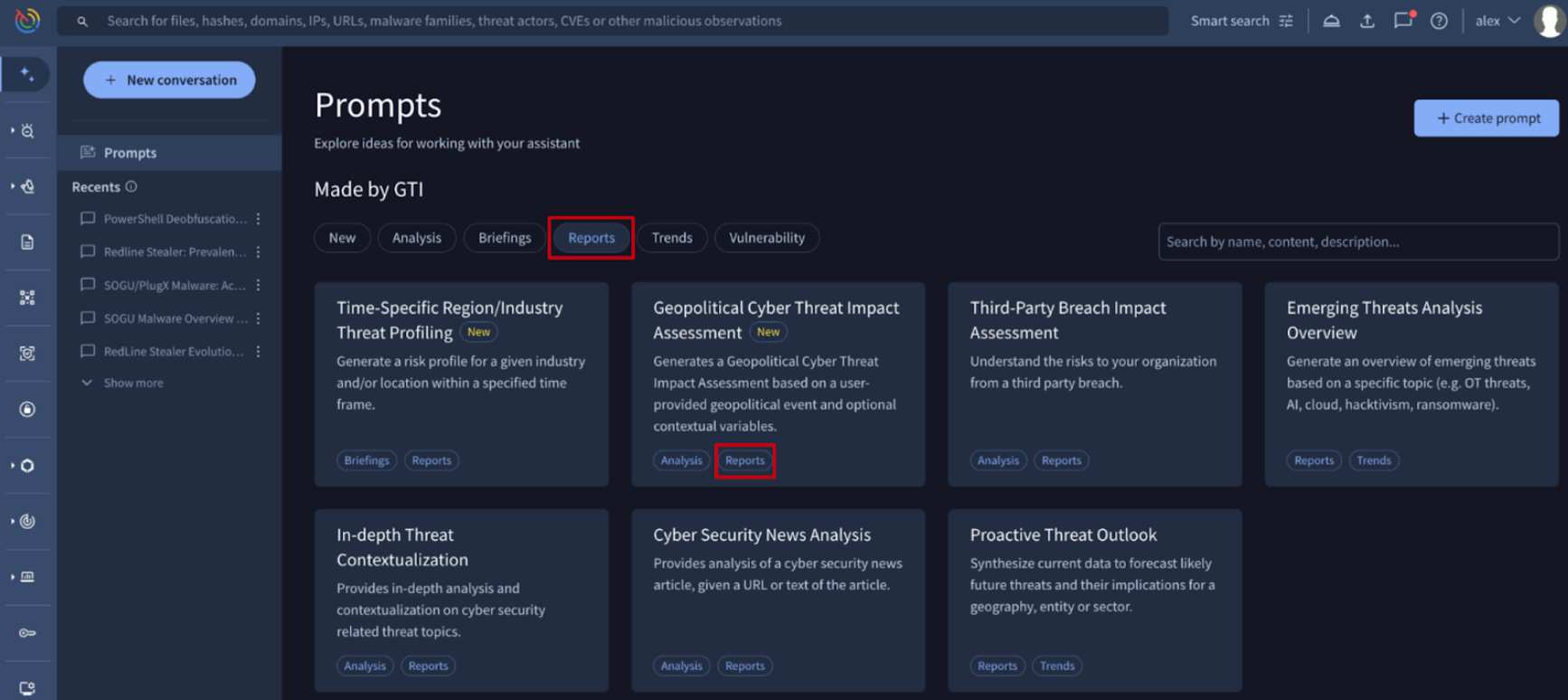 We have introduced a Reports tag as a new prompt template category. This tag is automatically applied to templates crafted by the Google TI team that are specifically designed to generate structured outputs such as emerging threat profiles, cybersecurity news summaries, and in-depth analysis. Users can now filter by this tag within the Prompts view to instantly locate report-specific templates, streamlining the transition from raw intelligence to finished documentation.