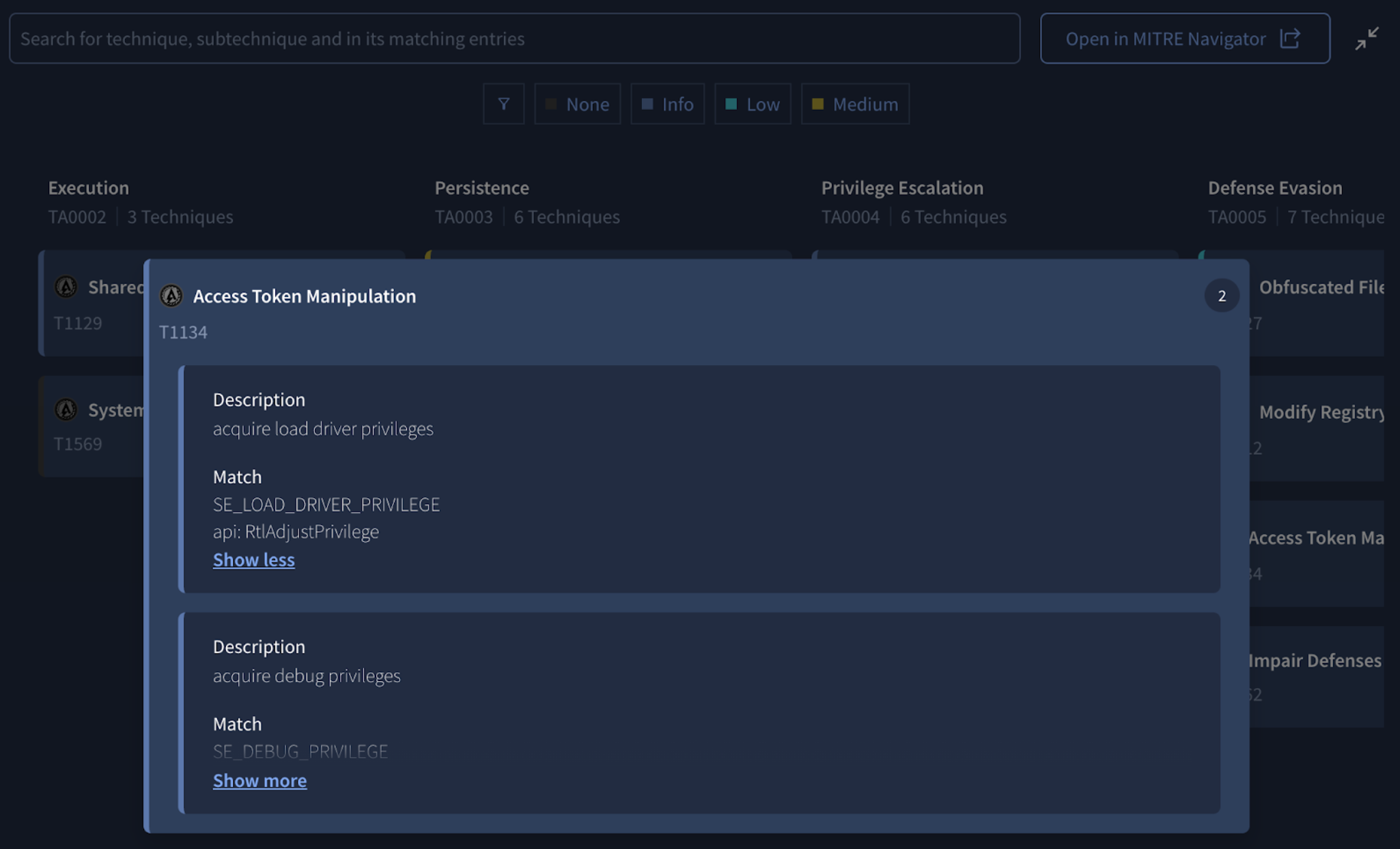 New MITRE ATT&CK map view for file behavior analysis. The MITRE ATT&CK Tactics and Techniques section in the file behavior report has been upgraded from a list view to an interactive, visual map. This new interface displays the detected TTPs using a color-coded matrix, allowing you to instantly visualize the tactics used across the execution chain, just like a heat map in the MITRE Navigator. You can also use new filters by severity (info, low, medium, high) to focus on the most relevant or severe techniques. By simply clicking on the TTP card, you can then visualize the specific commands or activities (the Procedures) associated with that technique. See example.