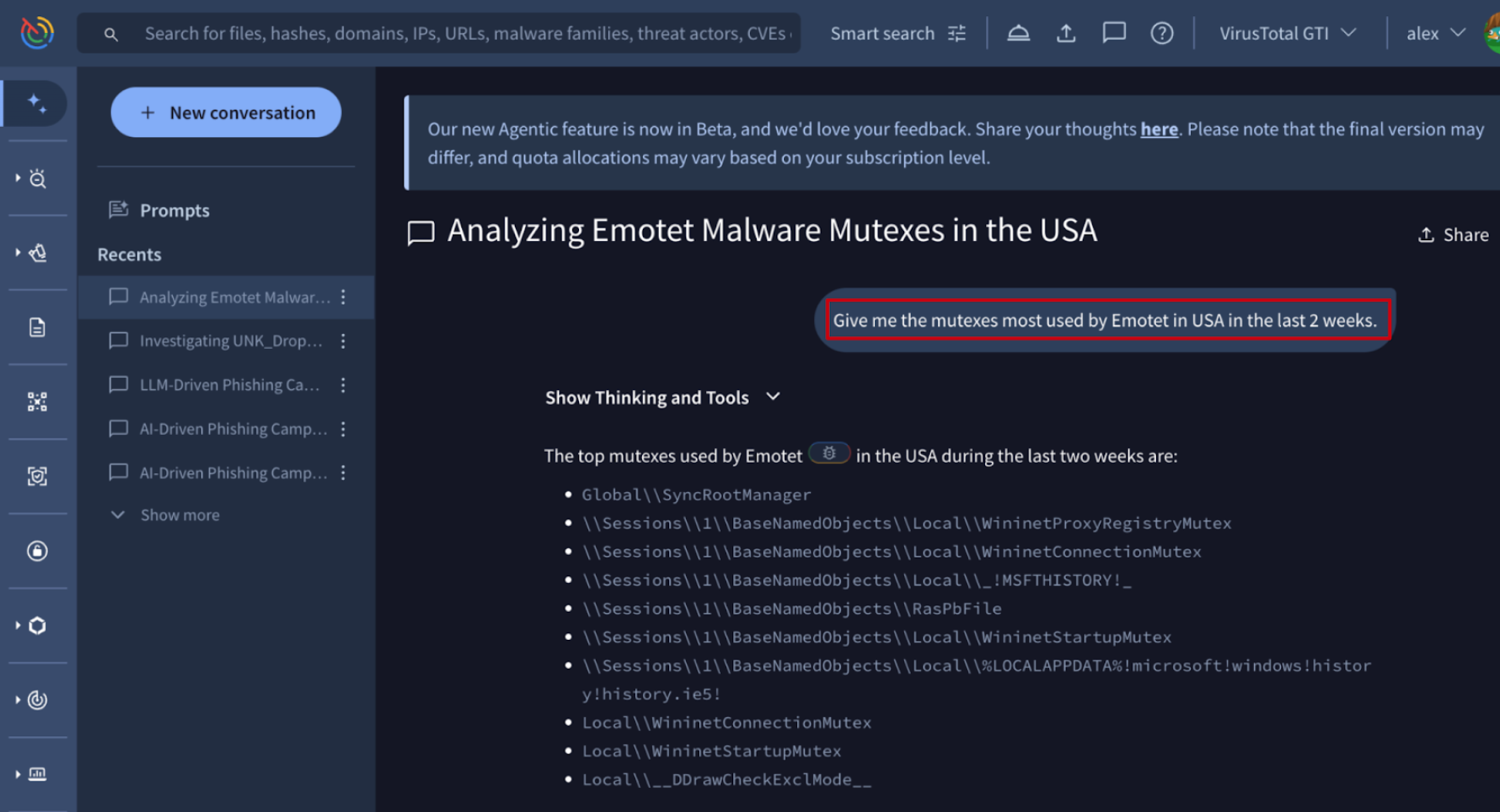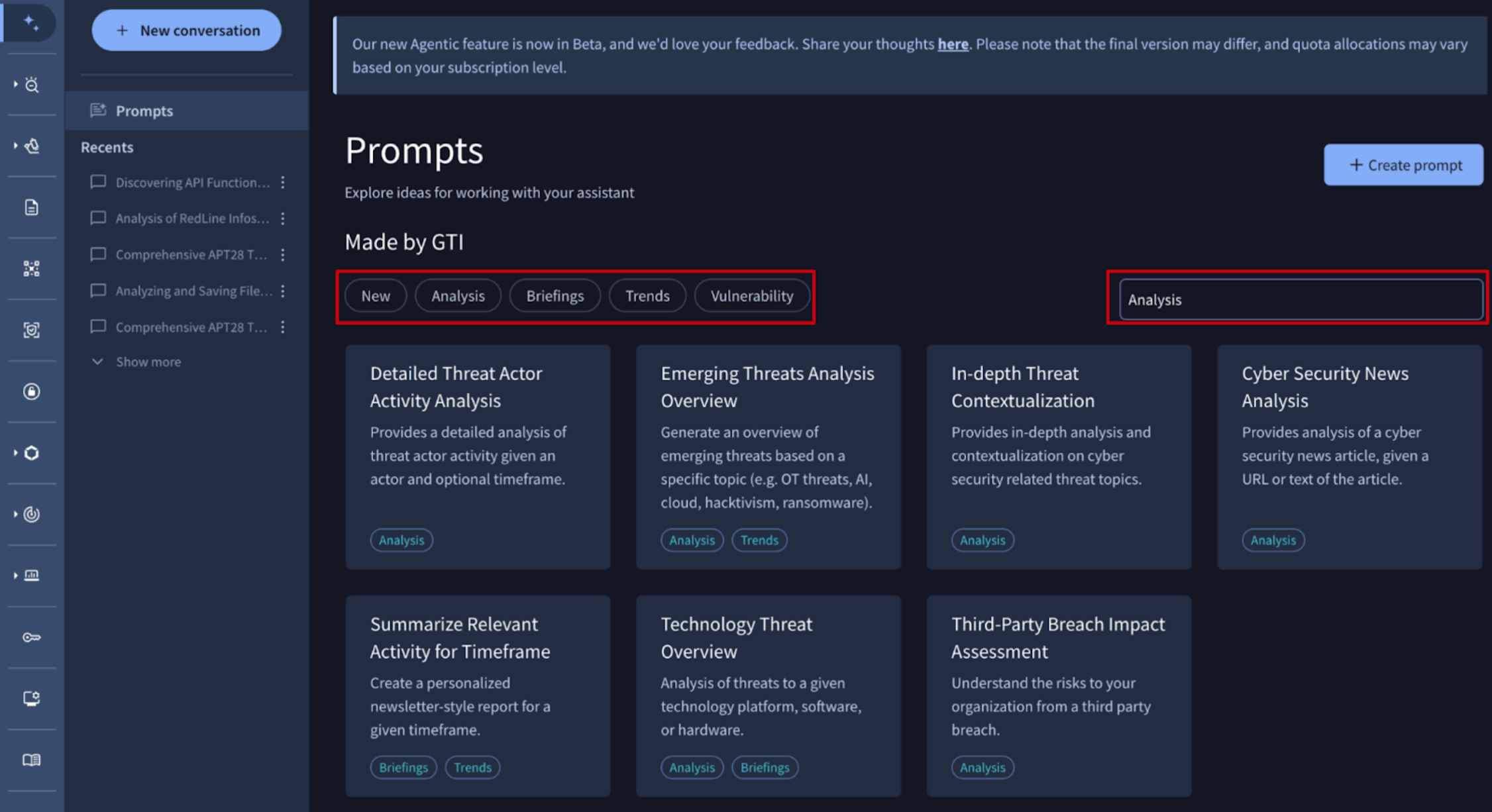 🆕 Tagging and Search for Agentic Prompts. Agentic Prompts are reusable query templates within the Agentic conversational AI platform. They allow security analysts to create standardized, structured instructions for the AI agents to automate and accelerate recurring threat investigation, malware analysis, and reporting workflows in Google TI. Users can now assign custom tags when creating or modifying an Agentic prompt. This feature introduces a new, powerful search and filtering capability in the prompt library, allowing analysts to quickly locate prompts based on criteria like Analysis, Briefings, Trends, Vulnerability and New prompts, or any other word from the prompt description.