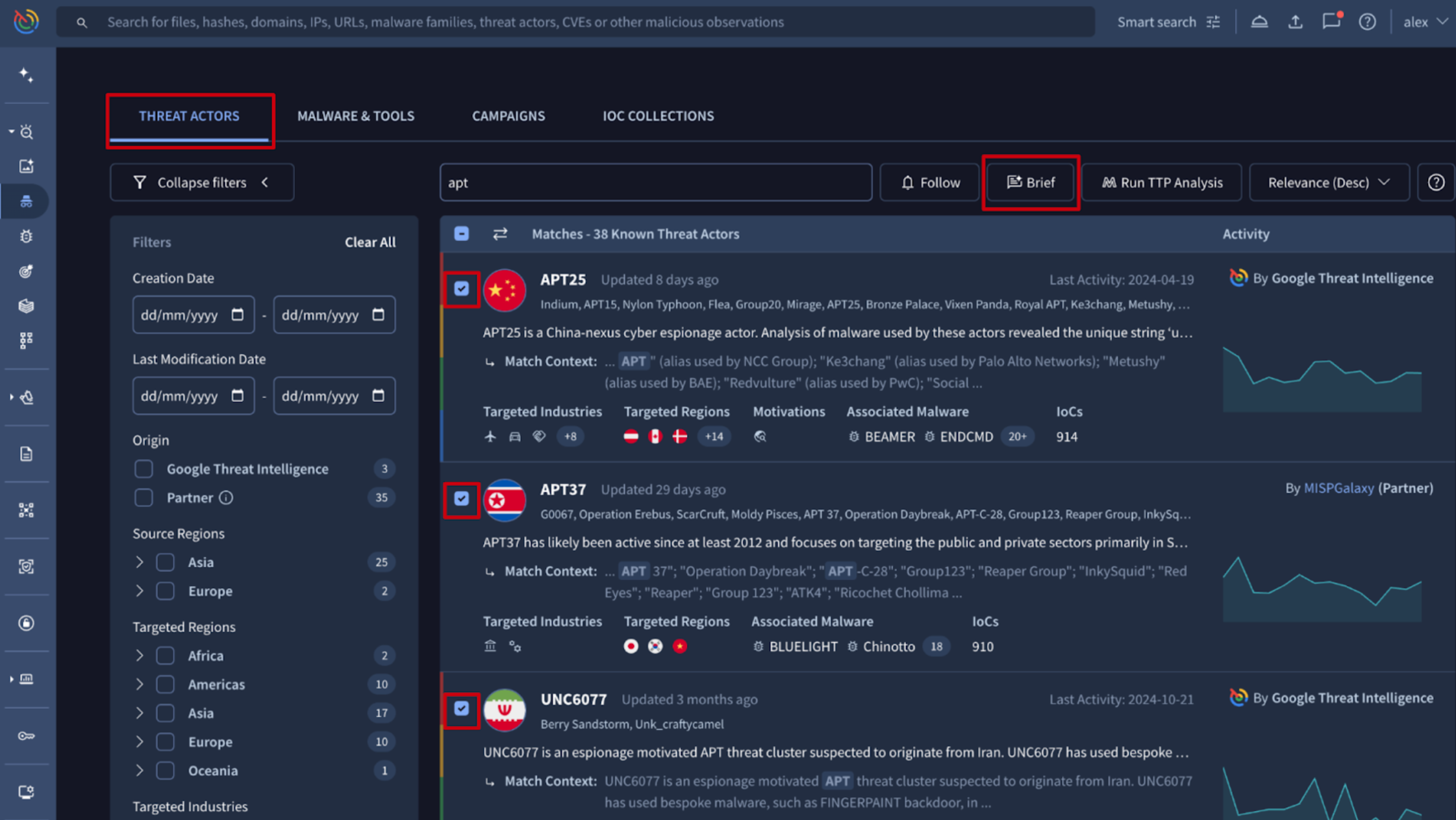 🆕 Intelligence at Speed - Instant Executive Briefs Powered by Agentic. We have integrated the Agentic Conversational AI platform across all major Threat Intelligence object list views (such as Threat Actors, Malware & Tools, Campaigns, IoC Collections, Reports, and Vulnerabilities). This new capability is accessed via a single Brief button. After selecting a set of objects, clicking the Brief button automatically initiates a conversation within the Agentic interface, allowing the AI to produce an executive summary focused specifically on the selected entities' recent activity.