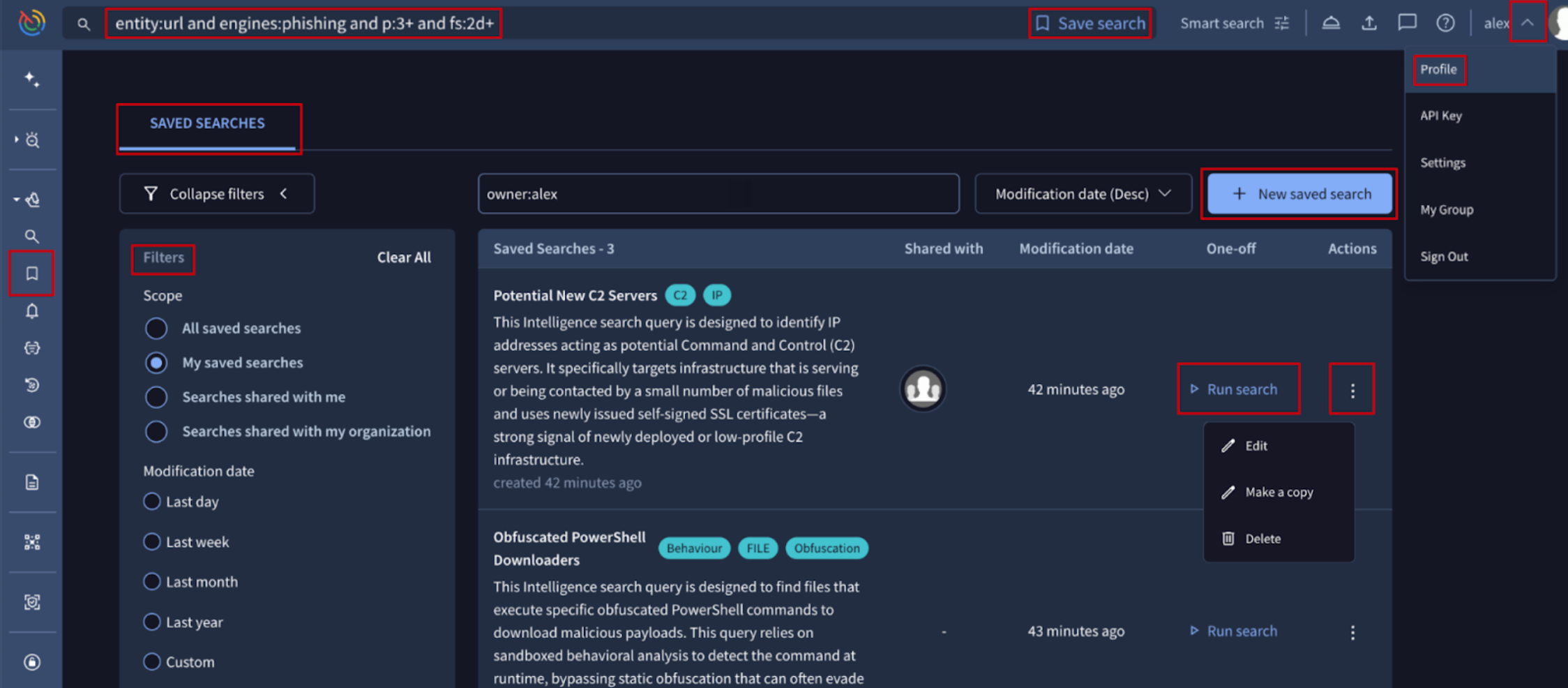 🆕 Saved Searches. The Intelligence Search feature allows users to execute complex and powerful queries against our expansive dataset of malicious indicators, enabling threat hunters to uncover infrastructure, track campaigns, and identify evolving threats. Instead of manually reassembling the required search modifiers for a specific use case every time a search has to be performed, now users can save queries by creating Saved Searches to efficiently reuse or frequently execute threat intelligence searches across our vast database of IoC analysis reports (files, URLs, domains, IP addresses).