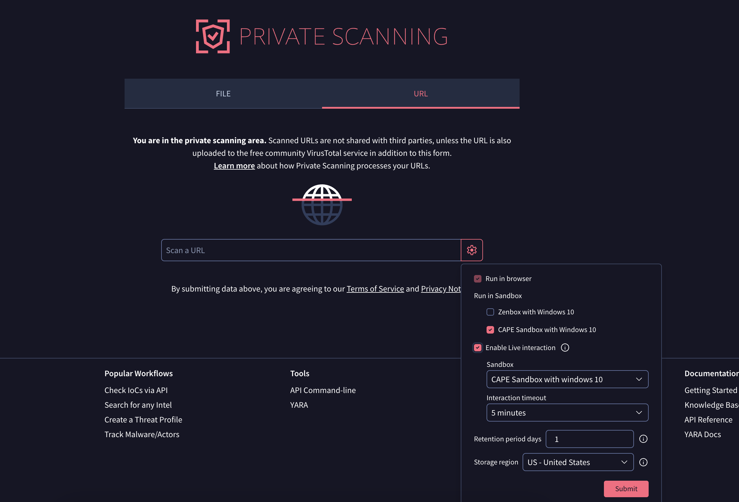 🆕 URL Private Scan check for Public Report availability. The Private Scanning feature allows users to analyze URLs in a dedicated, private environment. This is essential for inspecting sensitive URLs and performing in-depth analysis, such as interactive sandbox detonation, without contributing the results to the public corpus. The platform now provides an immediate notification when a public report for a requested URL is already available, right before initiating a private scan. This allows users to decide whether they still require a private scan for specific reasons (e.g., interact with the sandbox during URL detonation or configuring a certain browser agent), or if the public report is sufficient, thereby preserving their Private Scanning quota.