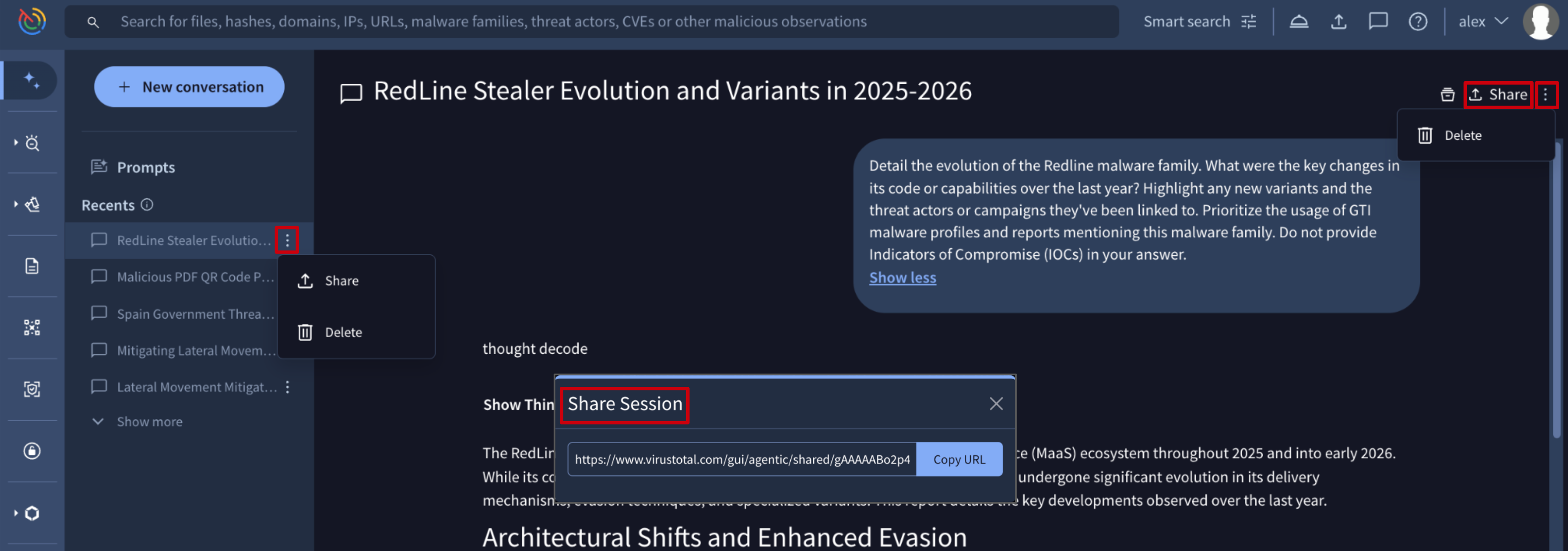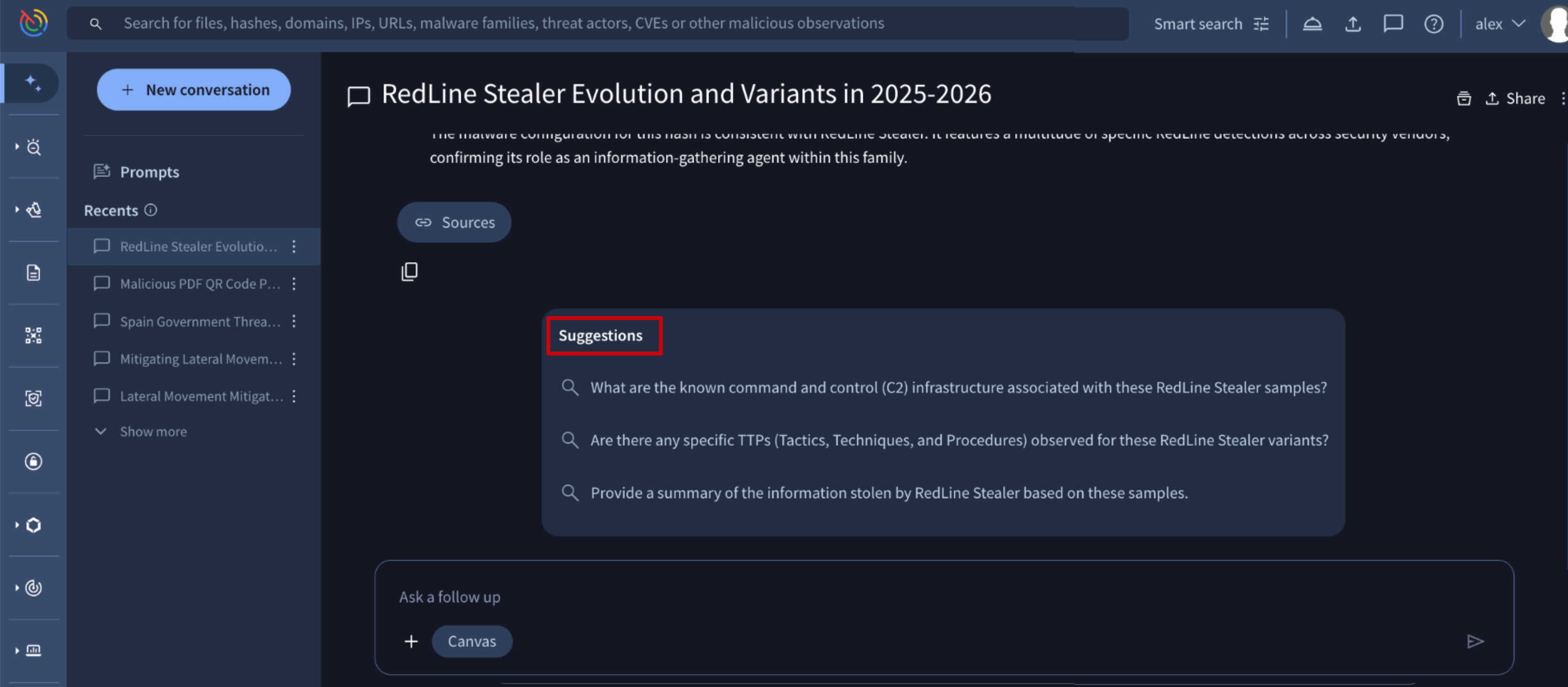 - "How do I query GTI for RedLine malware configuration files?" - which allows to Execute the query and Compute commonalities of IoCs in Agentic or Open in Google Threat Intelligence.