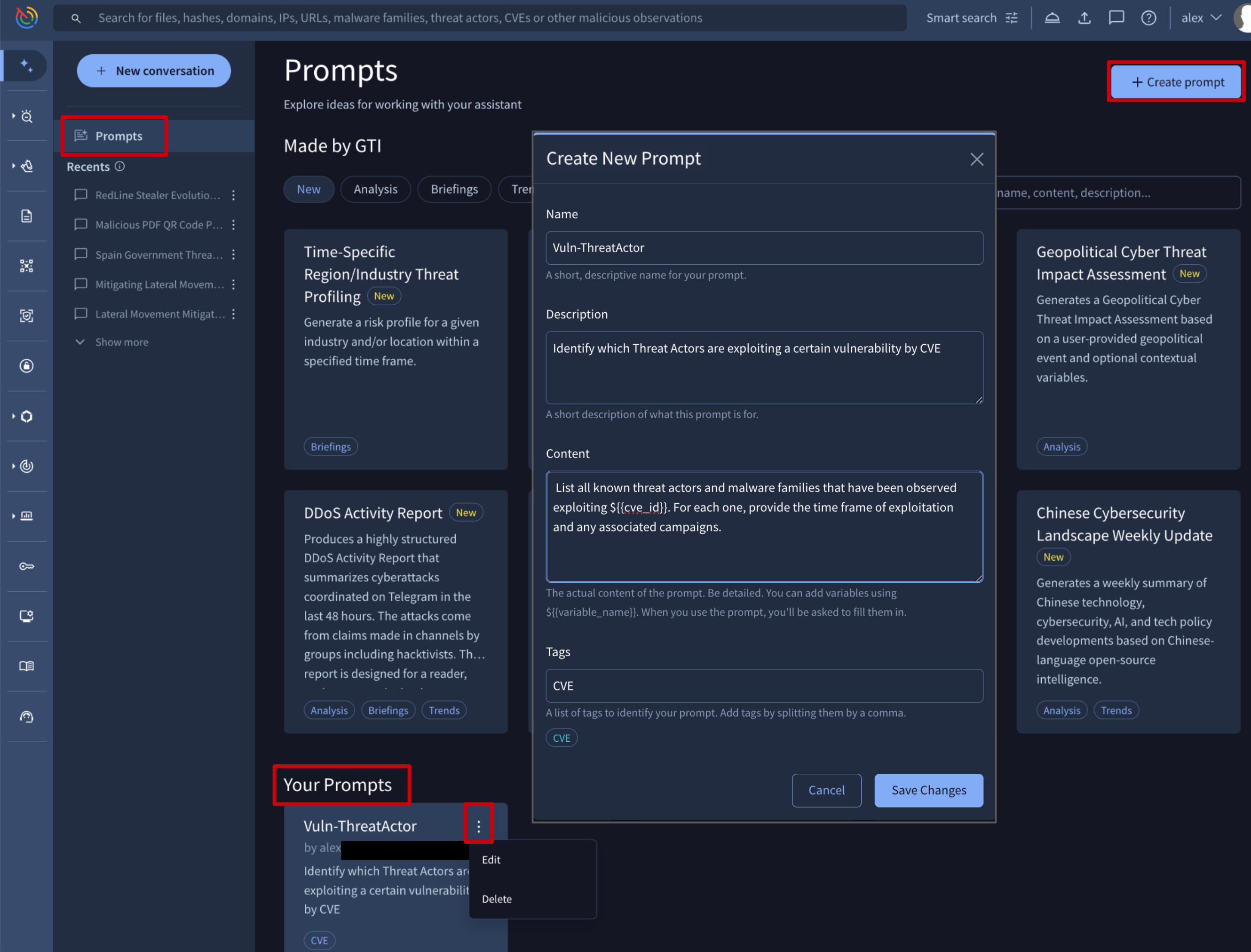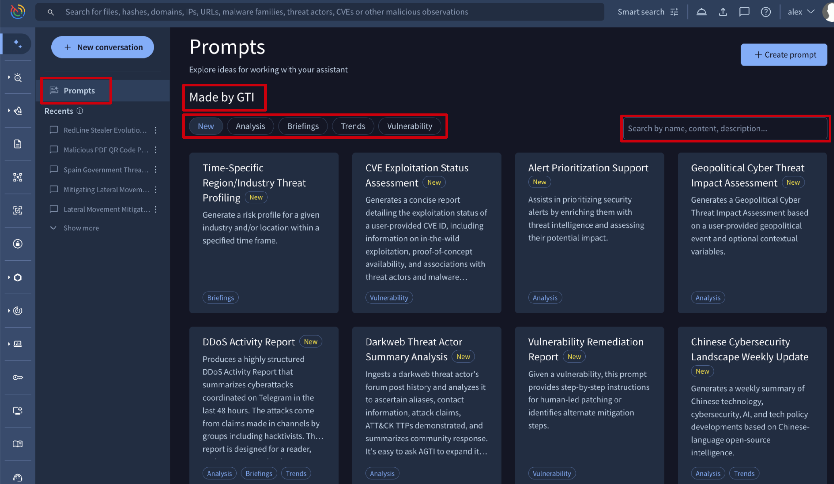 In the Agentic platform, prompts are treated as entities. The Prompts menu in Agentic provides access to a comprehensive list of all available prompts, including pre-built templates from our team and custom prompts saved by the user to expedite repetitive tasks within Google Threat Intelligence.