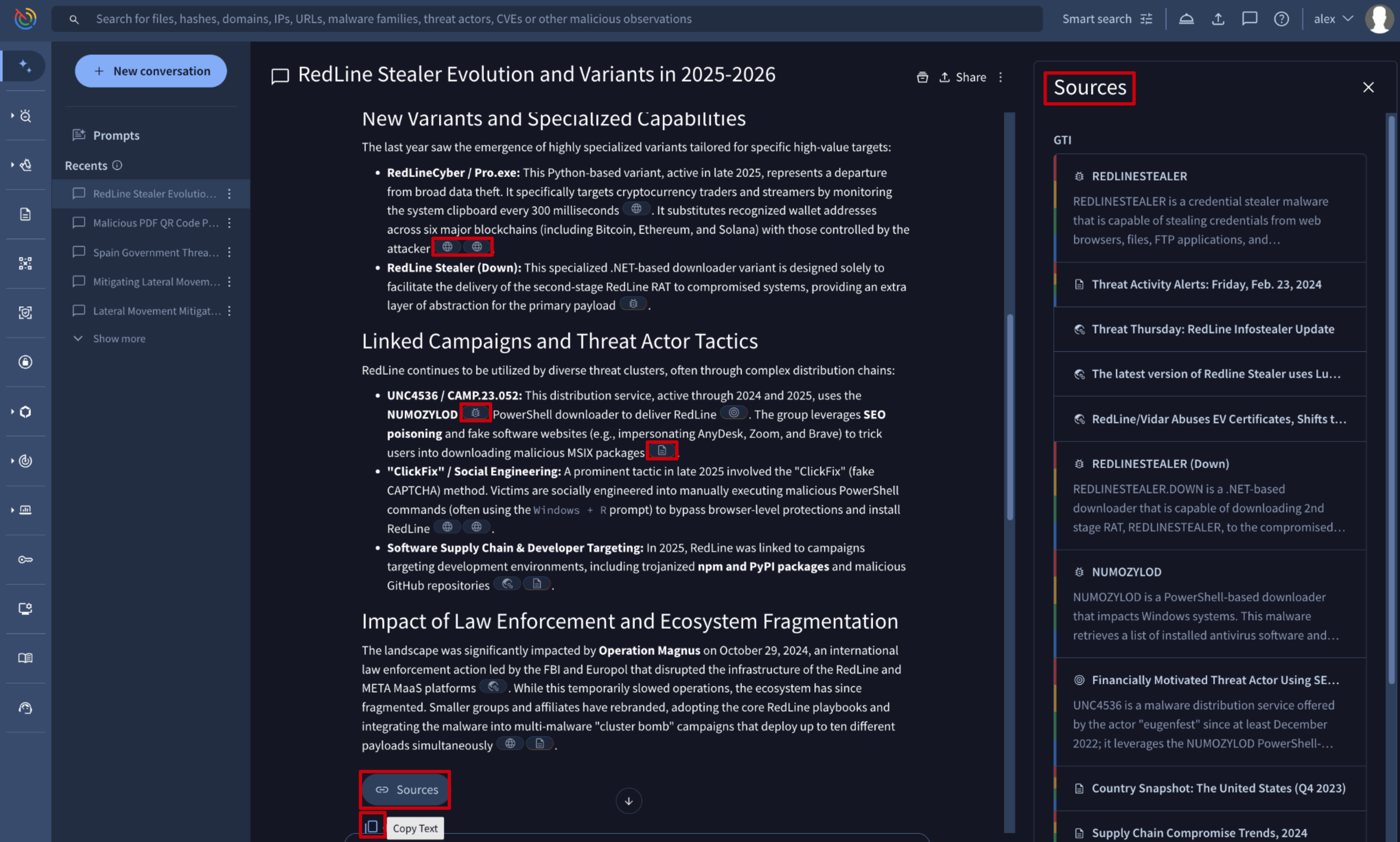 All user's conversations with activity in the last 30 days are logged in the Recents section on the left side of the screen, while those with no activity during this window will be automatically deleted. As long as you continue to interact with a specific conversation, it will remain accessible, ensuring your ongoing investigations are preserved while clearing out stale data.