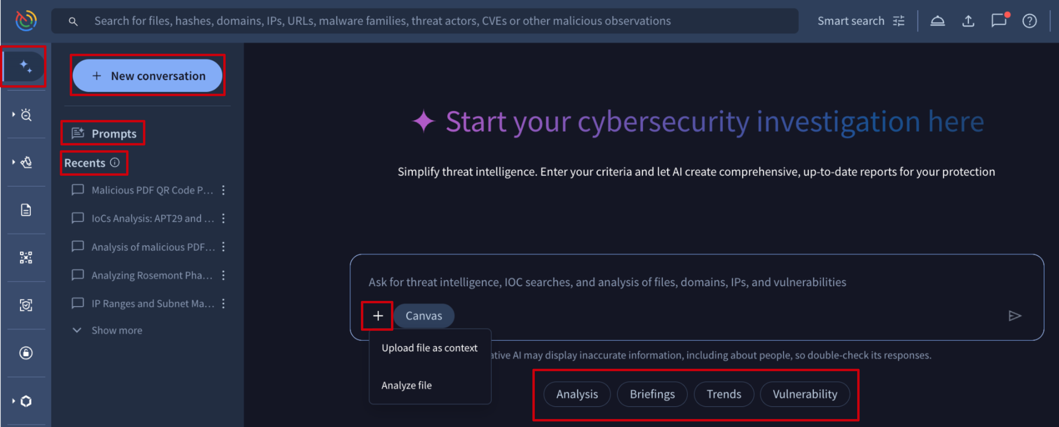 New conversations can be started from several places within the Google Threat Intelligence platform. To access the tool, navigate to the Agentic option in the left menu. Once there, you can begin a new conversation using one the following methods: