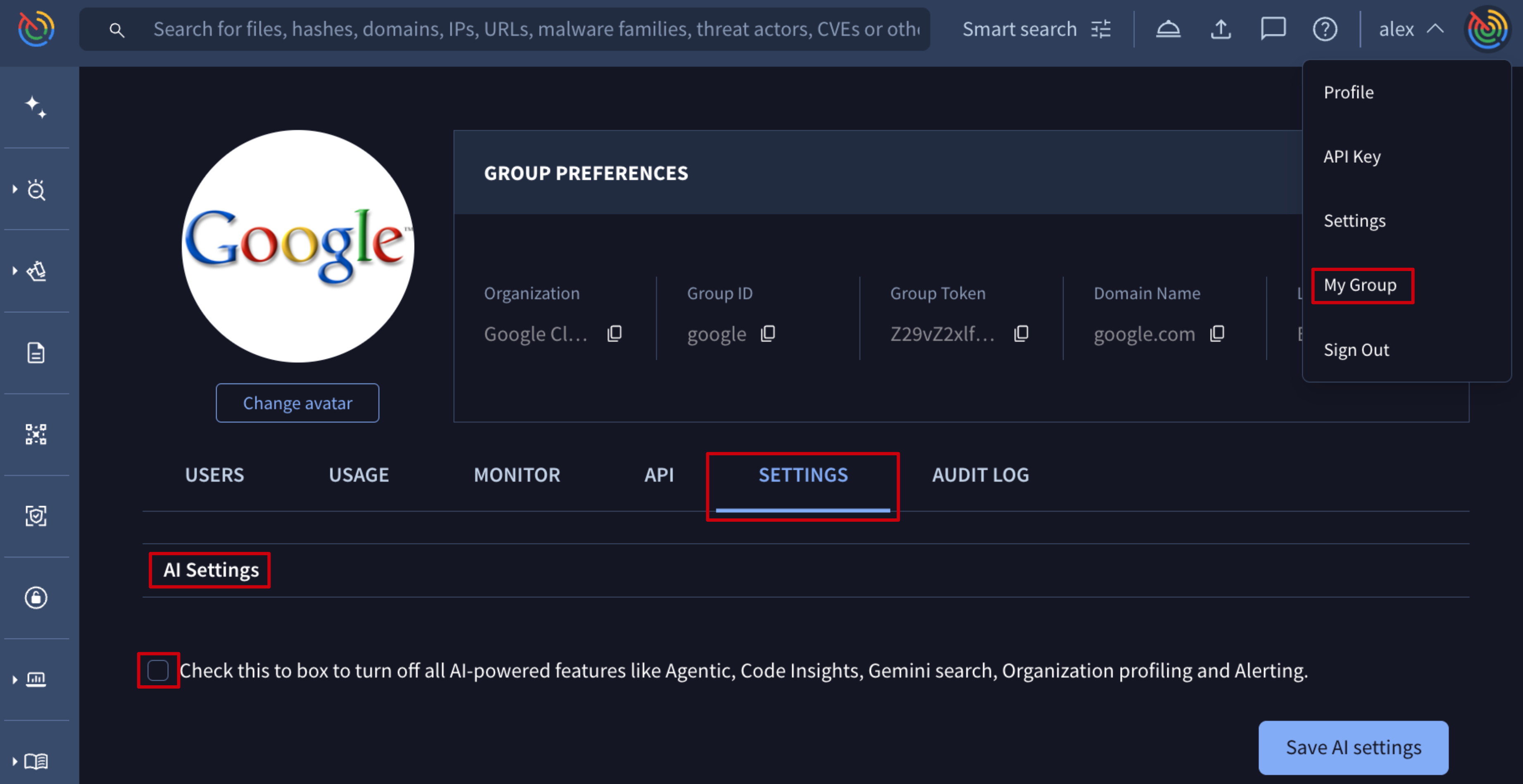 If you need to disable all AI tools (including the Agentic tool) for your group to meet legal and compliance requirements, follow these steps as an administrator of your Google Threat Intelligence group: