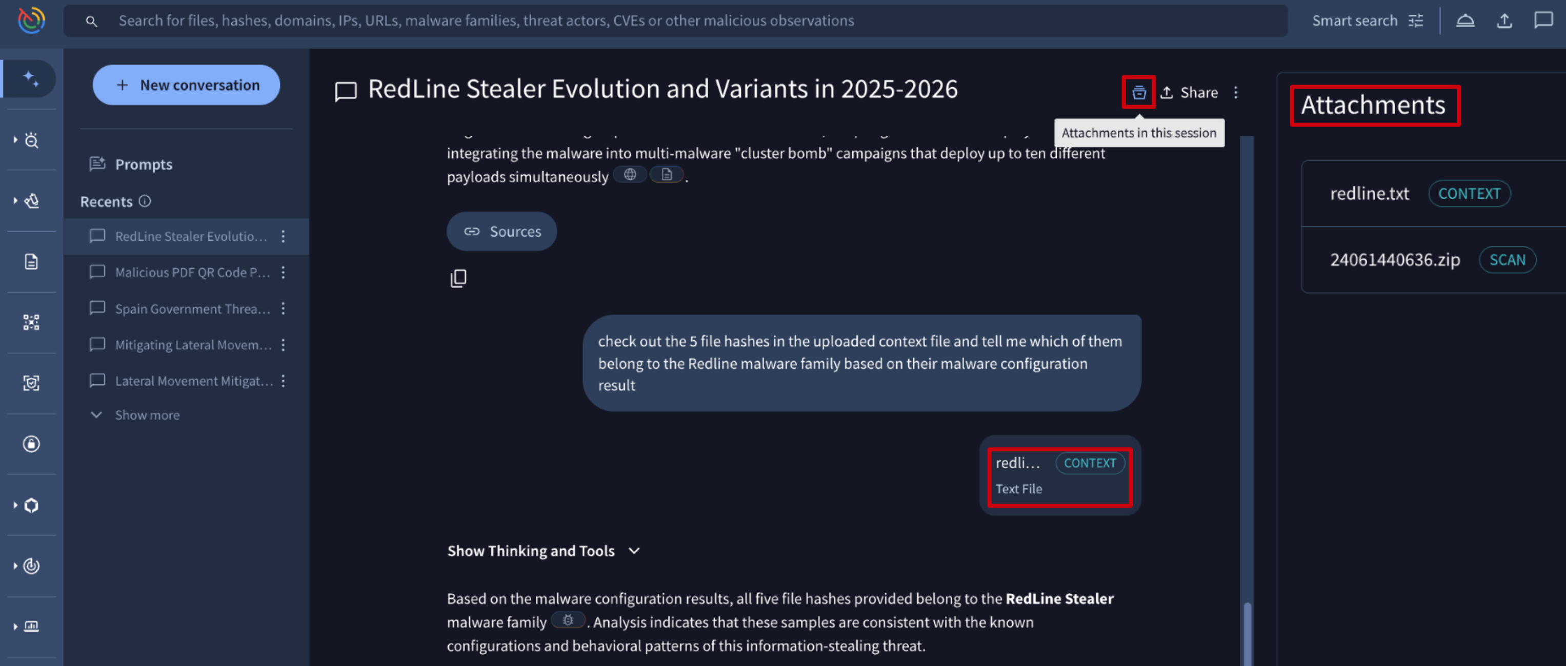 - Attachments Drawer: the Attachments in the session button at the top opens the Attachments panel on the right. This panel lists all files uploaded during the conversation. Files are labeled for clarity: those uploaded as context are marked with a CONTEXT tag, while those submitted for analysis are marked with a SCAN tag.