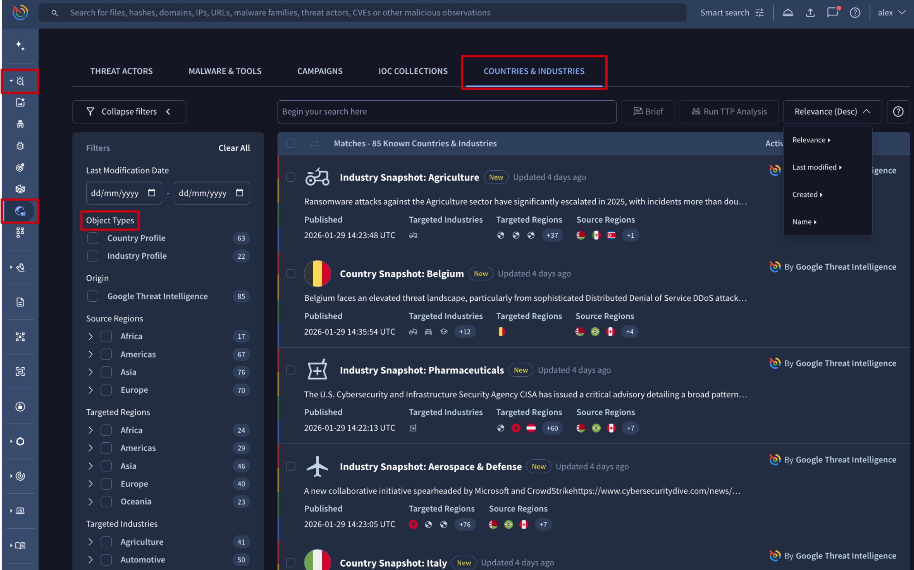 Expanding on our Threat Profiles, the Countries and Industries Profiles within the Threat Landscape module provide consolidated, targeted intelligence tailored to your specific geography and sector.