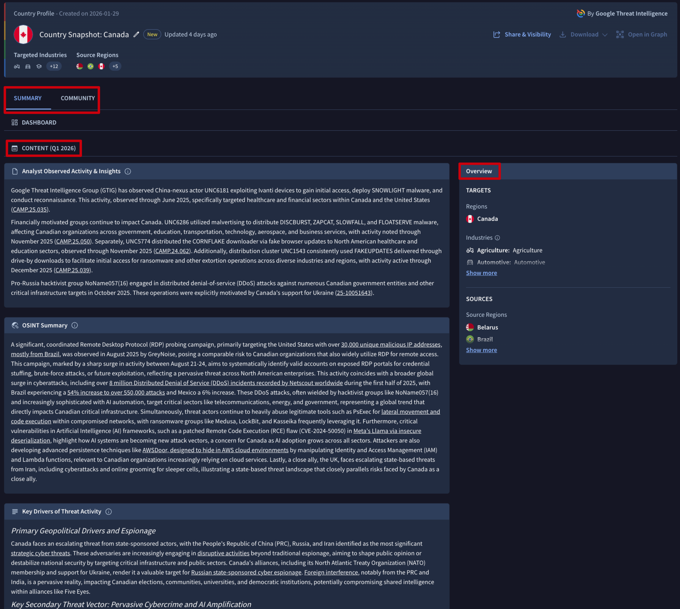 To streamline your workflow, these profiles provide AI-generated summaries that synthesize relevant curated data from our GTIG team, selected relevant OSINT articles and content describing key drivers of threat environments to keep the user informed on whatās more relevant eliminating the need for manual data triaging, allowing you to make informed security decisions in a fraction of the time.