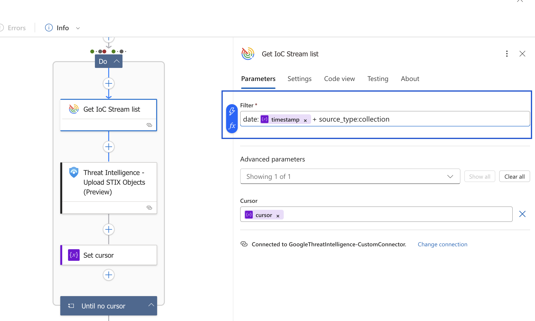 - The playbook includes a "Recurrence" node that determines how frequently it runs to fetch new IoCs. This can be configured to suit your needs.