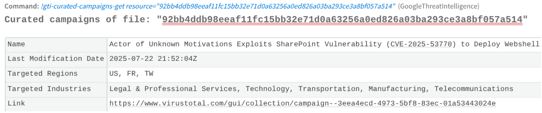 Based on the high-fidelity intelligence received from Google TI, XSOAR playbooks can orchestrate an immediate and decisive response without human intervention. For instance, if GTI confirms a file hash is a known ransomware variant, a playbook can automatically trigger actions across other integrated tools: quarantine the endpoint via an EDR solution, block the hash enterprise-wide, and add any associated malicious domains or IPs to a firewall blocklist. Furthermore, the integration enables proactive defense. XSOAR can be configured to periodically query Google TI's custom threat feeds (e.g., those generated by Livehunt rules) and automatically ingest new IoCs related to specific threats, feeding them directly into defensive systems like firewalls and web proxies to block threats before an alert is even generated.