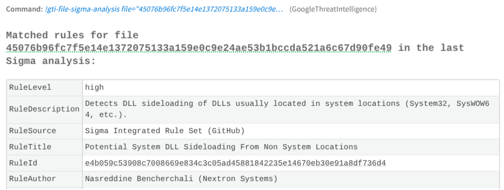 Another possibility for triaging a file is to obtain the matching sigma rules as is shown in the next image: