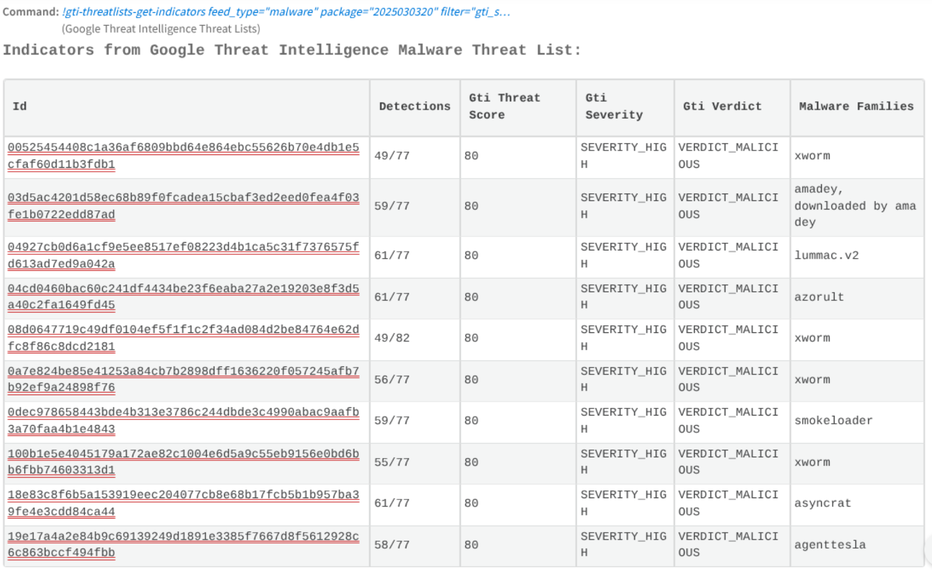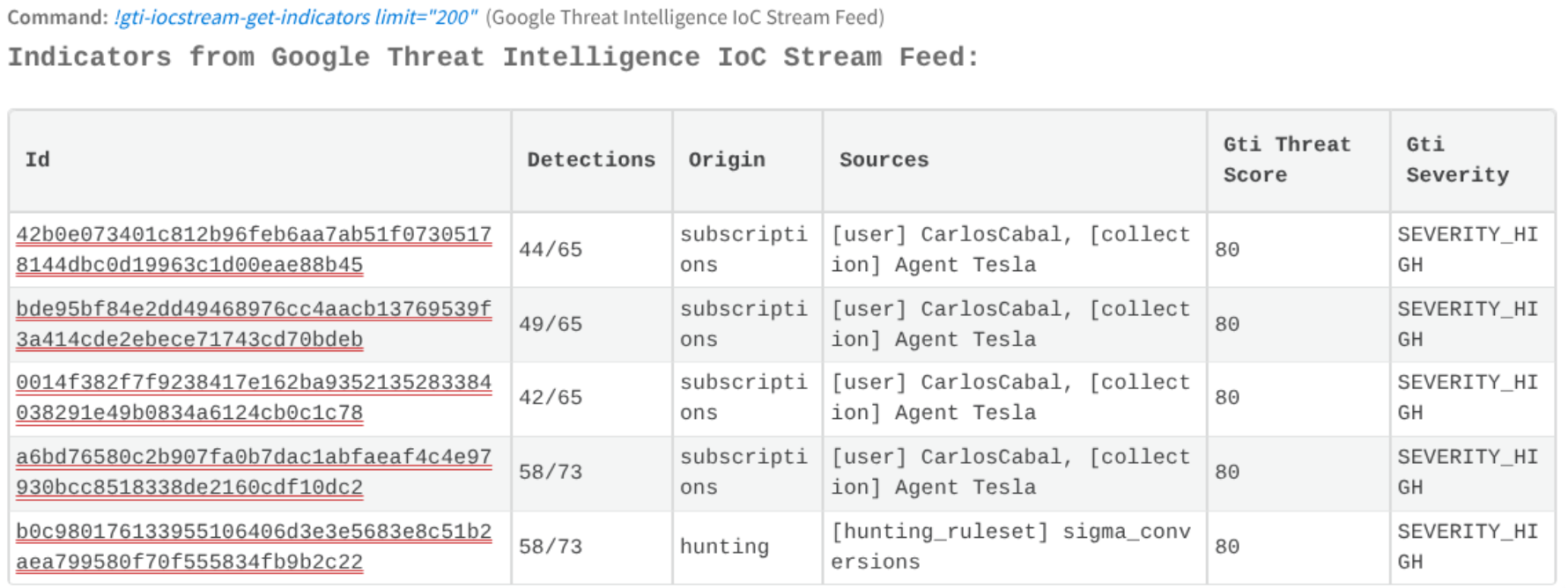 This component fetch Google TI Threat Lists matches as indicators. There are 14 categorized threat list: cryptominer, first-stage-delivery-vectors, infostealer, iot, linux, malicious-network-infrastructure, malware, mobile, osx, phishing, ransomware, threat-actor, trending and vulnerability-weaponization.