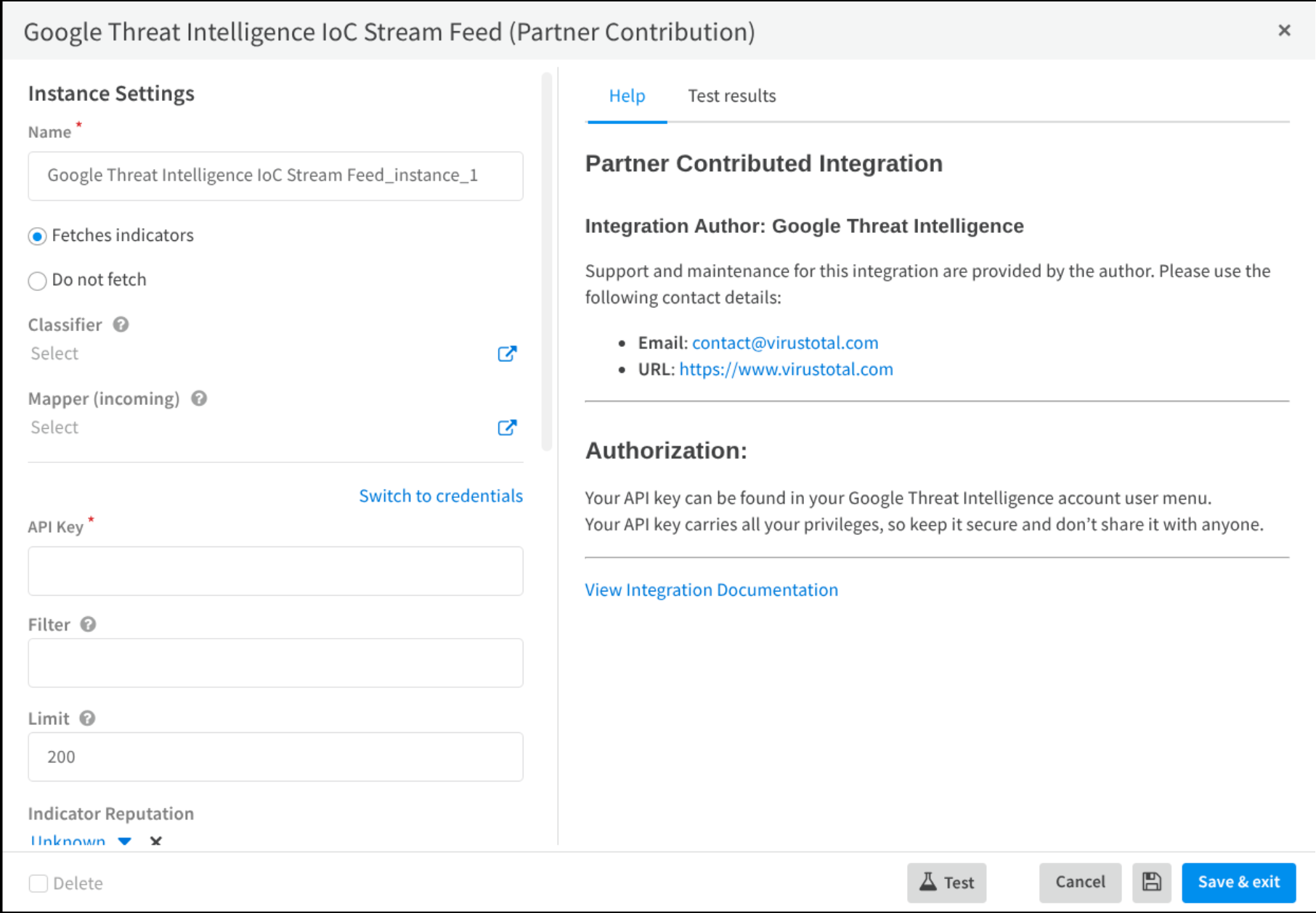 This component provides the feed integration to fetch GoogleTI IoC Stream notifications as indicators. Click on the following “Add instance” button to access this form and fill it with required information.