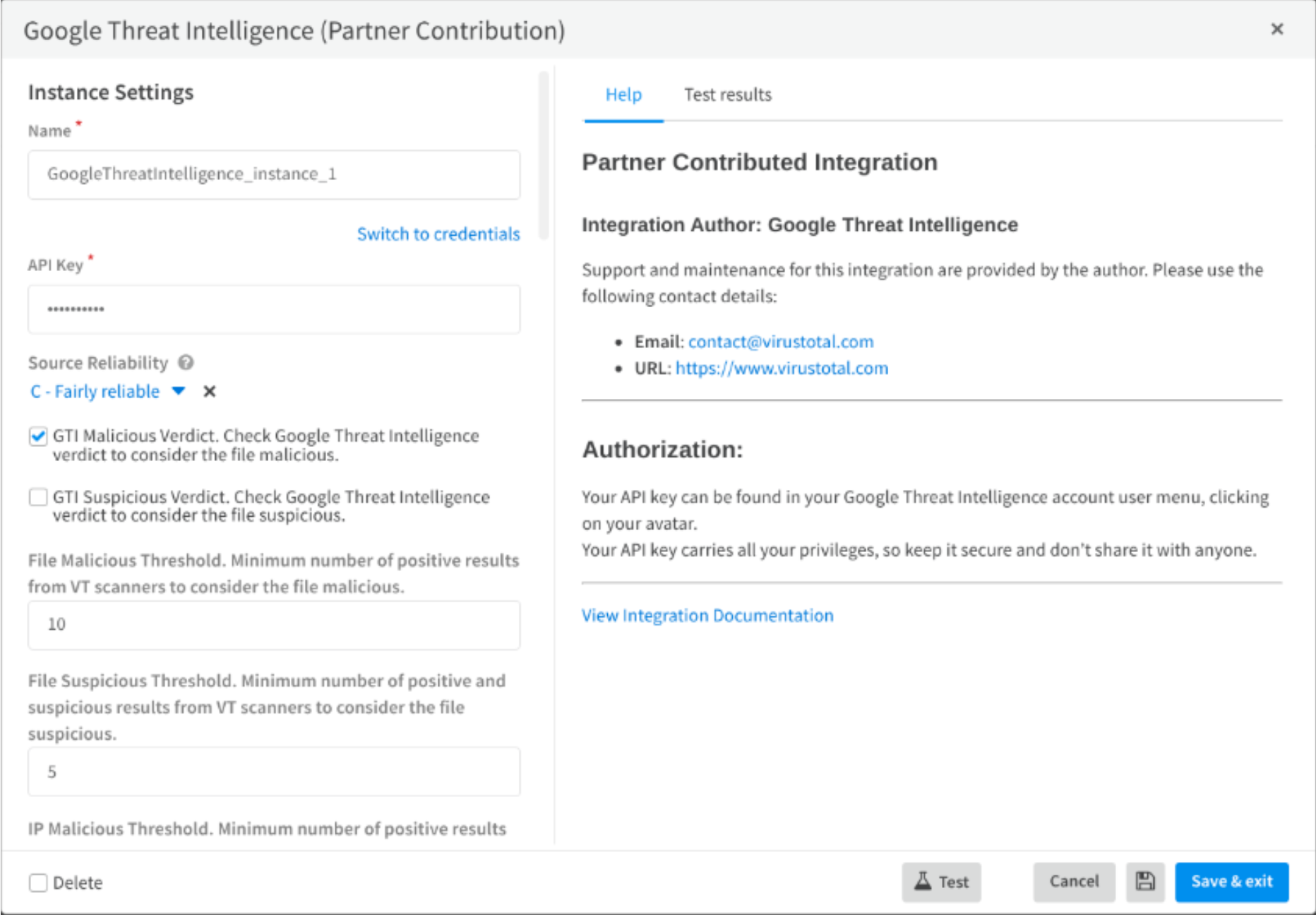 Google TI API Key: A valid API key is required to authenticate with the Google TI service. It is strongly recommended to use a service account API key rather than a key tied to an individual user account. Service account keys are better suited for automated systems. Please, notice that the usage of this integration entails API quota consumption.