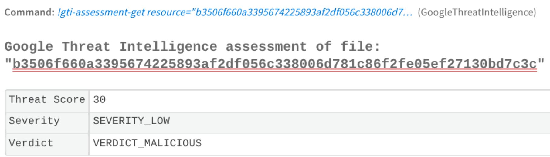 The most immediate and impactful use case is the automatic enrichment of security alerts. When an alert from a SIEM, EDR, or email security tool arrives in XSOAR, it contains Indicators of Compromise (IoCs) such as file hashes, domains, IPs, or URLs. An XSOAR playbook automatically sends these IoCs to Google Threat Intelligence for analysis. Google TI instantly returns a comprehensive report, including multi-vendor reputation, sandbox analysis results, threat categorization, passive DNS history, and any known relationships to malware families or threat actors. This data is parsed and displayed directly within the XSOAR incident, eliminating the need for analysts to manually research indicators. This allows the playbook to perform automated triage, immediately escalating high-confidence threats while downgrading or closing alerts for known benign indicators, saving significant analyst time.