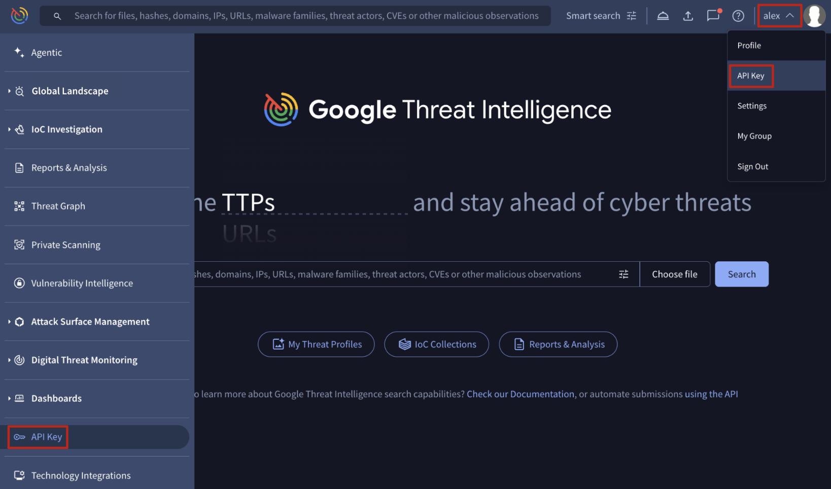 Your personal key will be listed in the section labeled GOOGLE THREAT INTELLIGENCE API KEY.