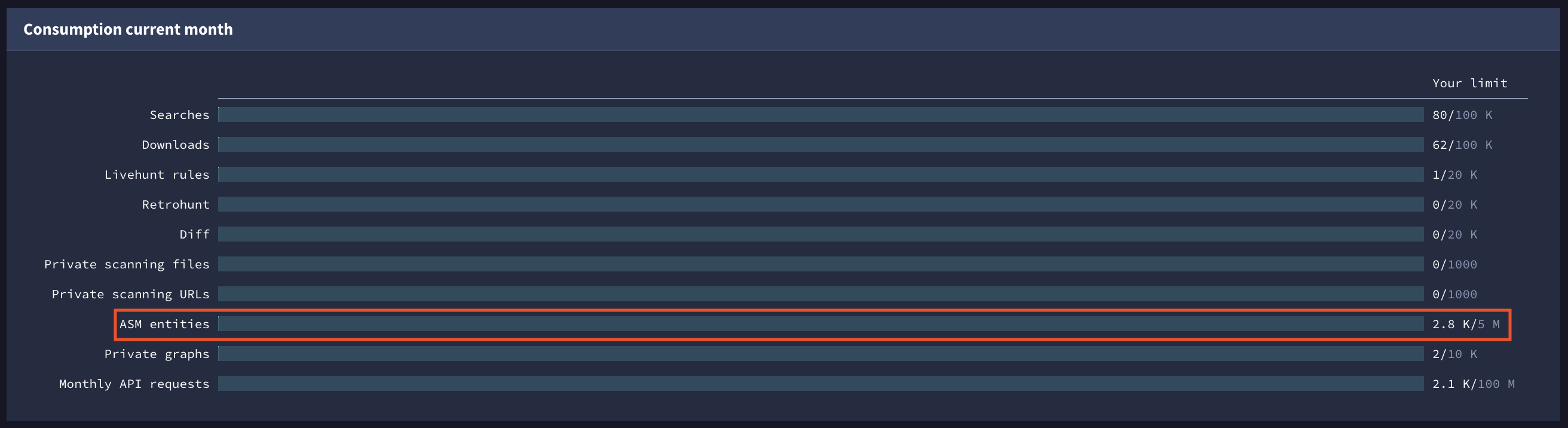GET /files/[sha256]) or its analyses (GET /files/analyses/[id]) won't consume quota either. Note that re-scanning the file (POST /files/[sha256]/analyse) will consume quota as any other API call. - ASM API endpoints: ASM endpoints won't consume API quota from your license, those requests will consume from your ASM entities quota.