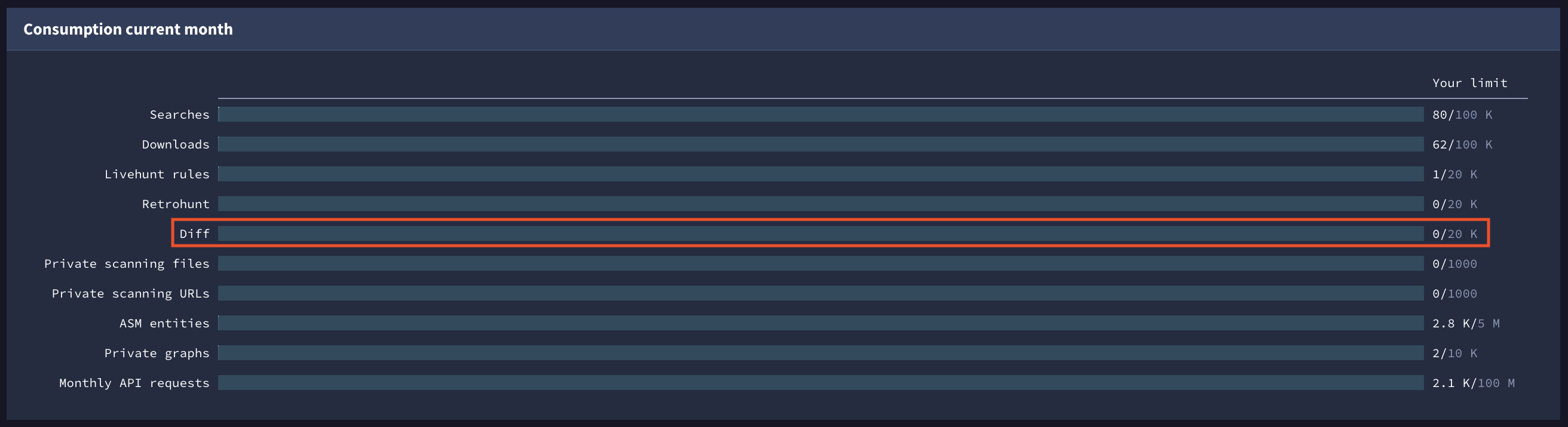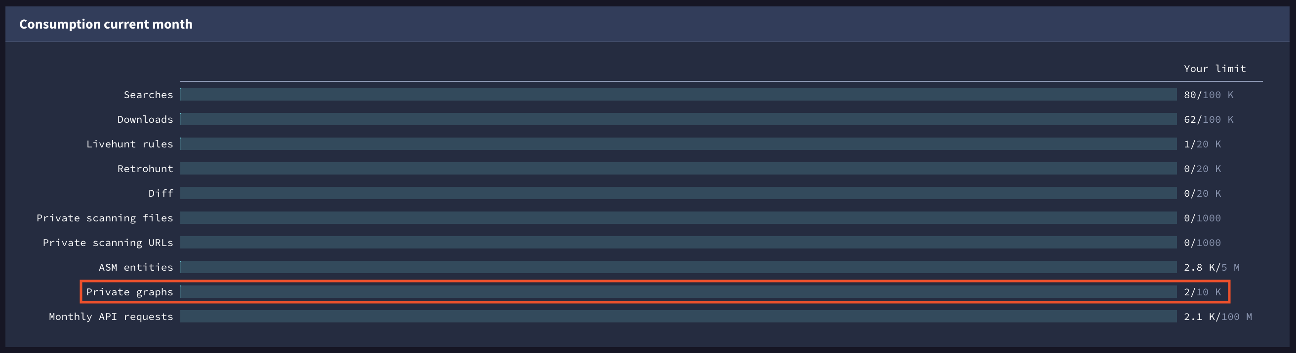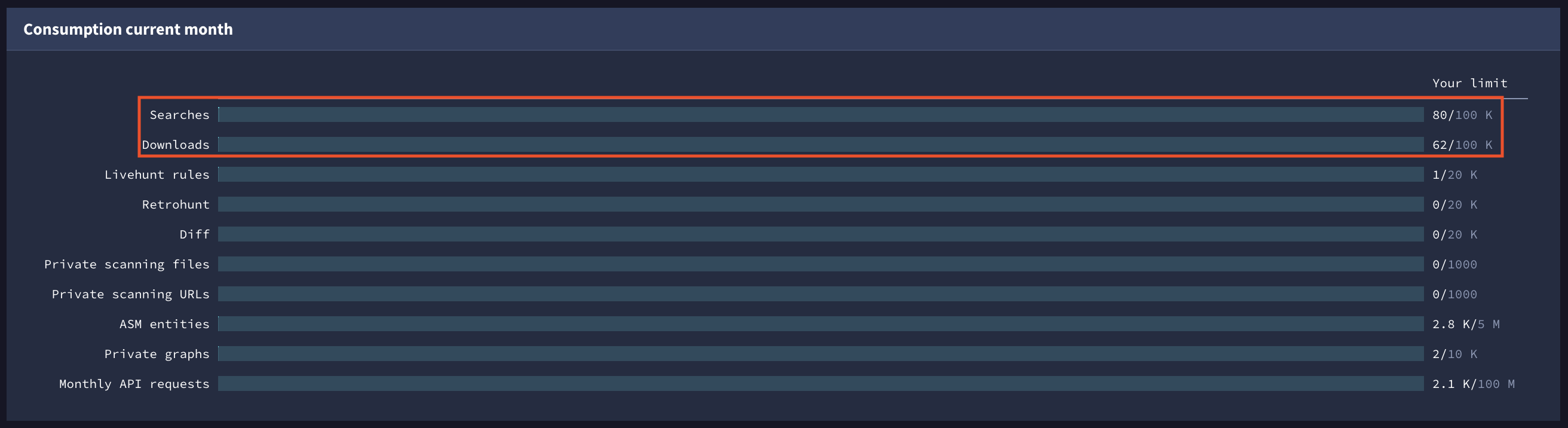 | SERVICE / QUOTA CONSUMPTION | Searches / Downloads | API requests | Livehunt | Retrohunt | Diff Sessions | Private Scanning Files | Private Scanning URLs | ASM Entities | Private Graphs |