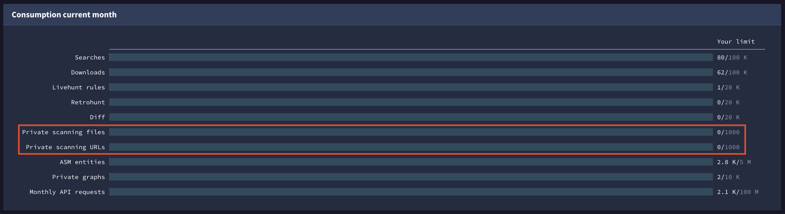 Each file submitted consumes 1 unit from your quota of Private Scanning files.