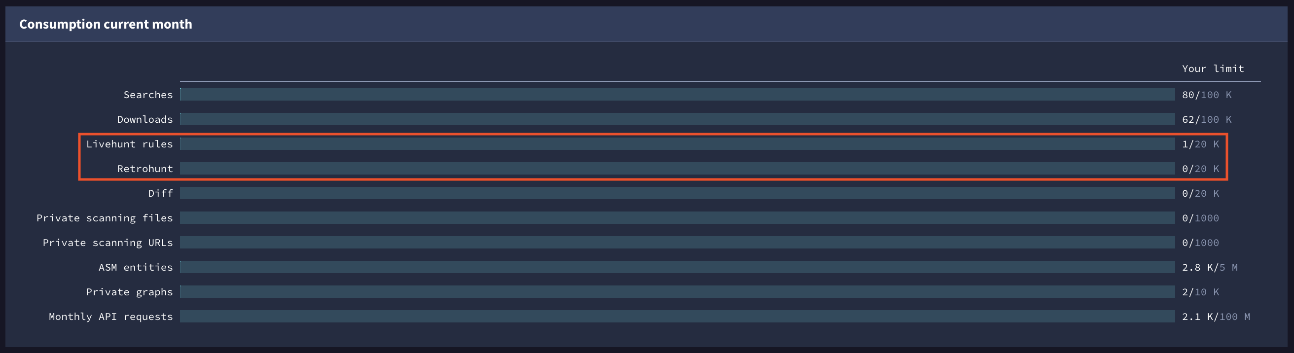 Each active YARA rule you create consumes 1 unit from your quota (inactive rulesets won't consume any quota). This means that if you have 3 rules in 1 active ruleset, you will consume 3 YARA rules from your Livehunt quota.
