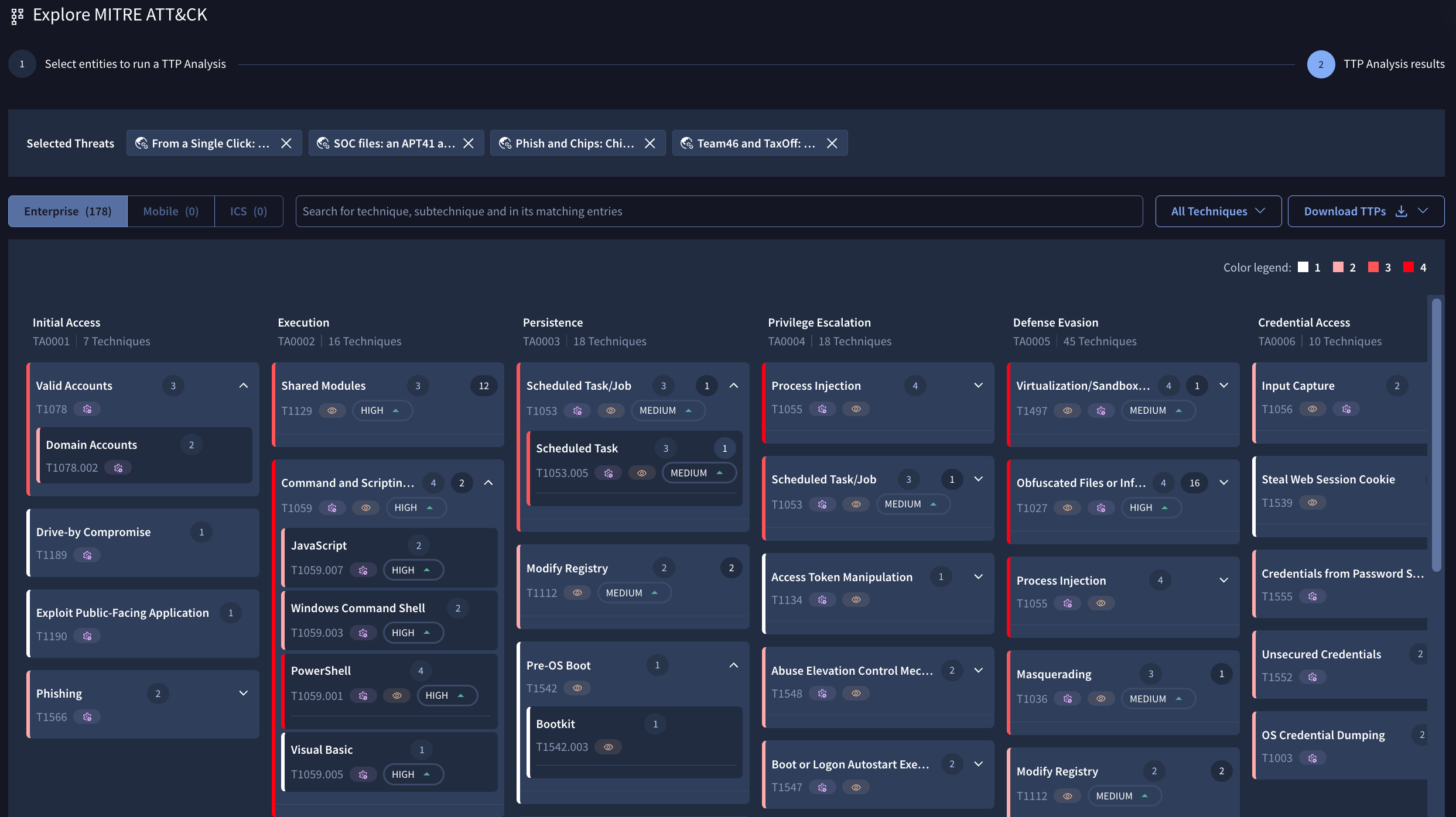 To use the tool, first filter and select the most relevant reports from the Reports & Analysis list view and then click the Run TTP Analysis button. This action will open the TTP Analysis tool, which displays a MITRE matrix of all TTPs found in your selected reports.