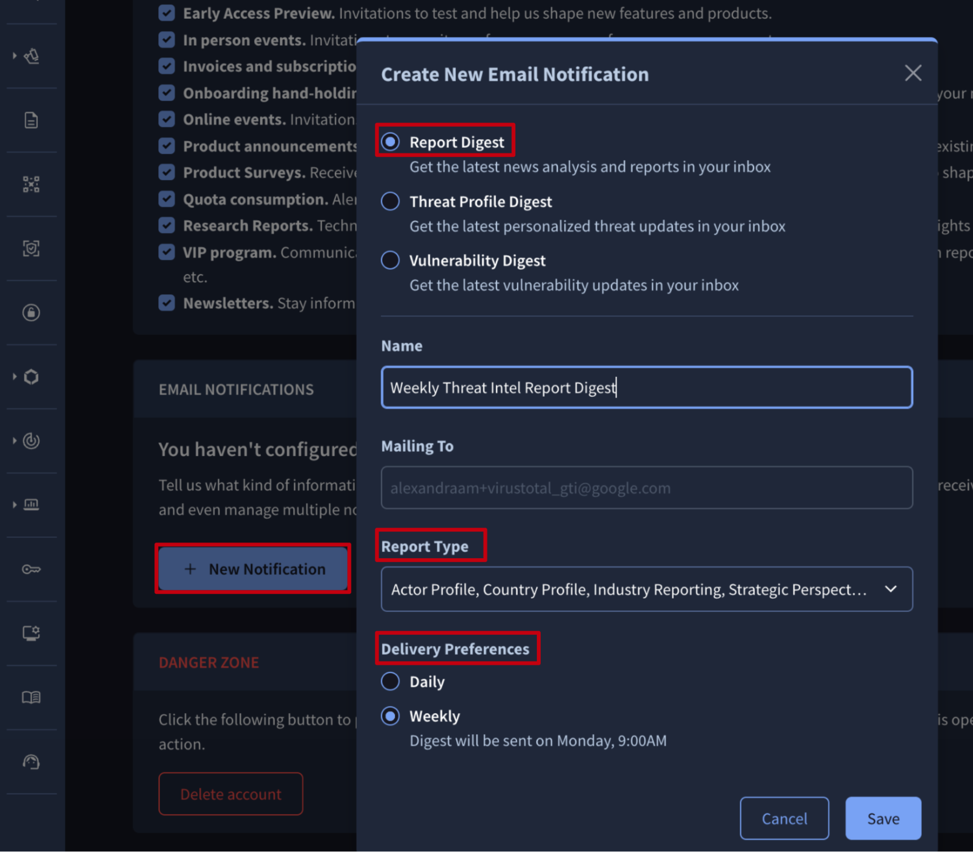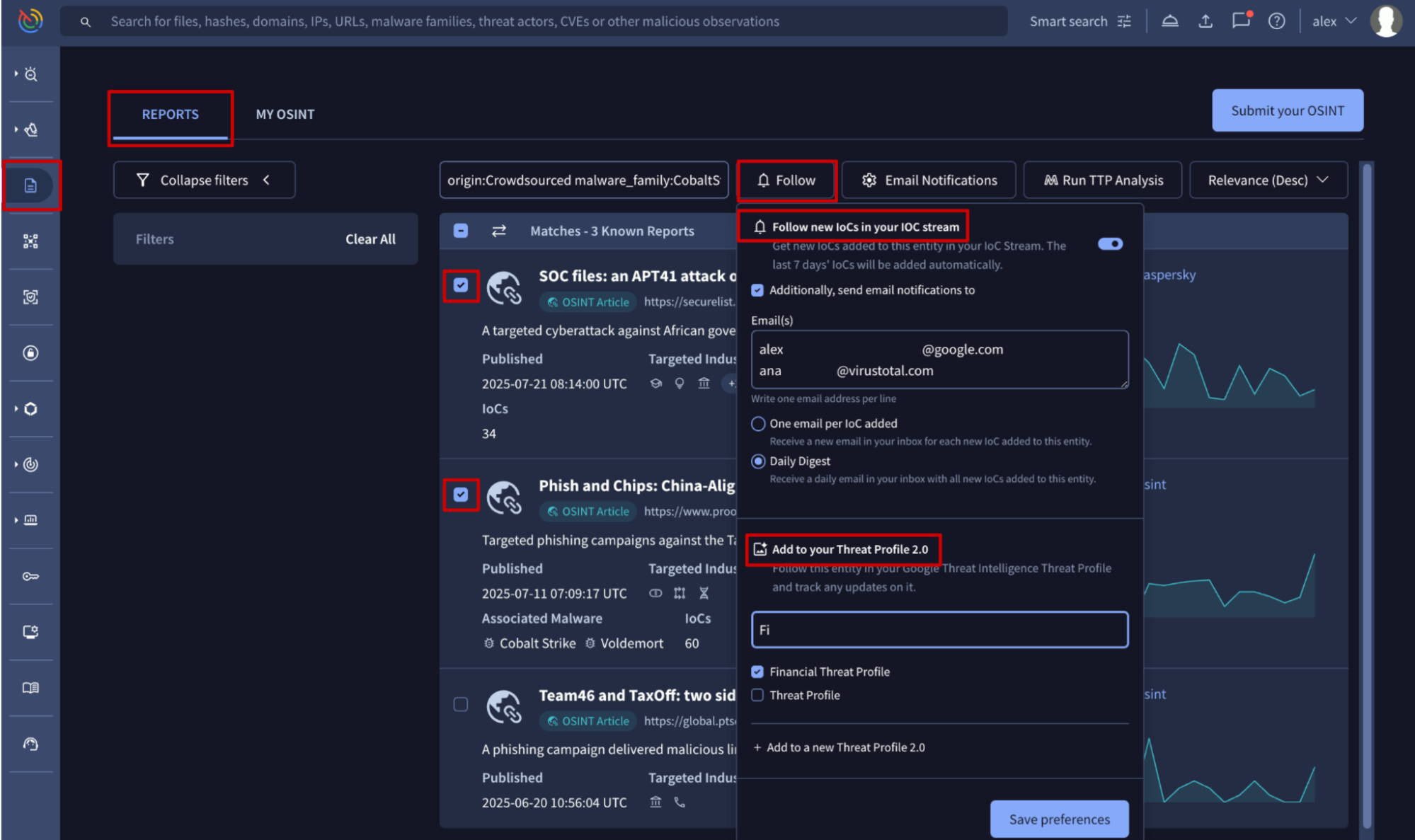 You can schedule email notifications to get regular report digests on the topics you care about, helping you stay informed about the latest threat landscape activity.