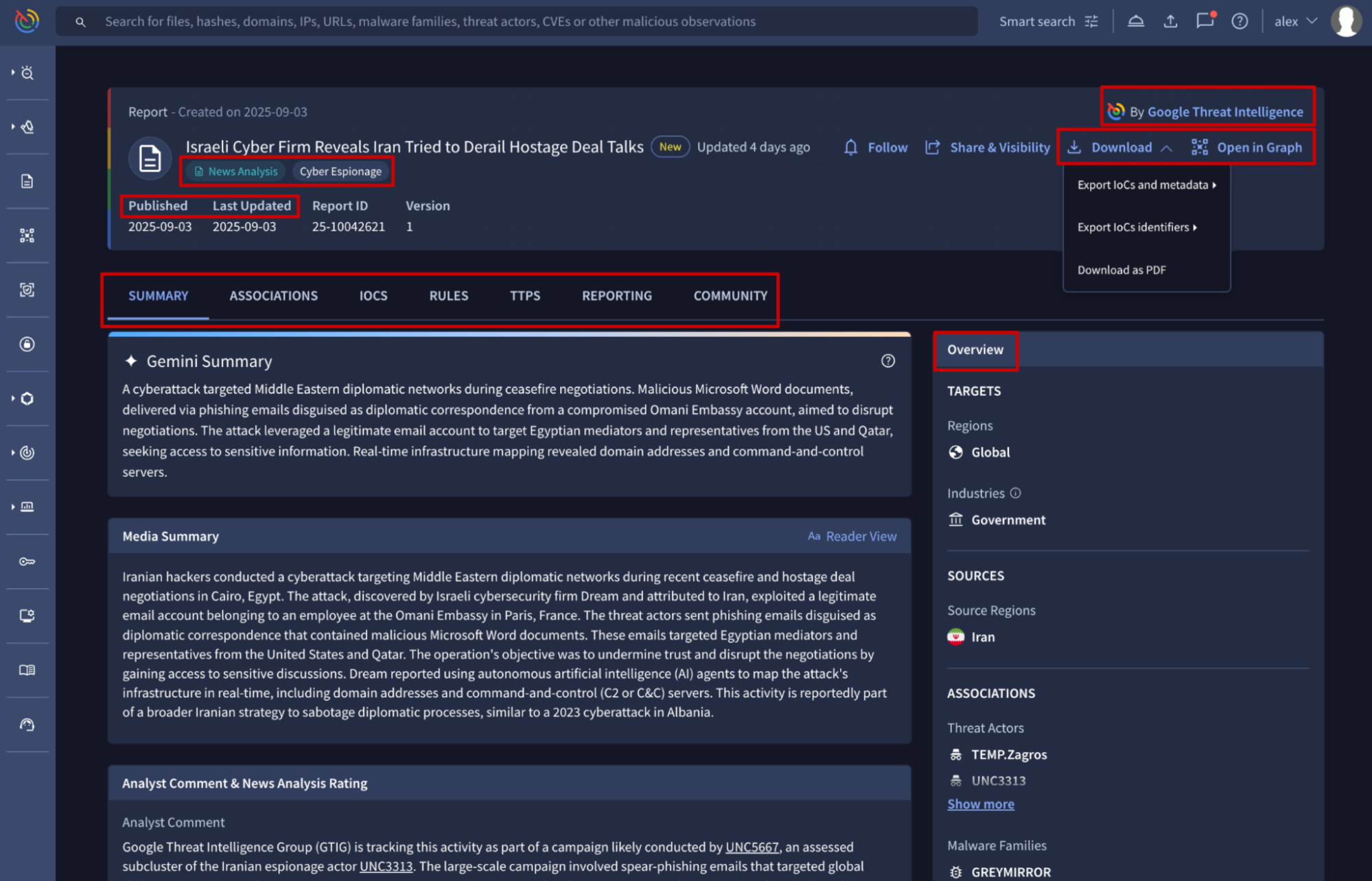- The SUMMARY tab is designed to help you quickly understand the report's key information. It starts with the Gemini Summary, followed by the full article content. Apart from this, it provides an overview of the threat context, the latest activity observed by our analysts on curated reports only, and direct links to other associated objects like Threat Actors, Malware & Tools, IoC Collections, and more.