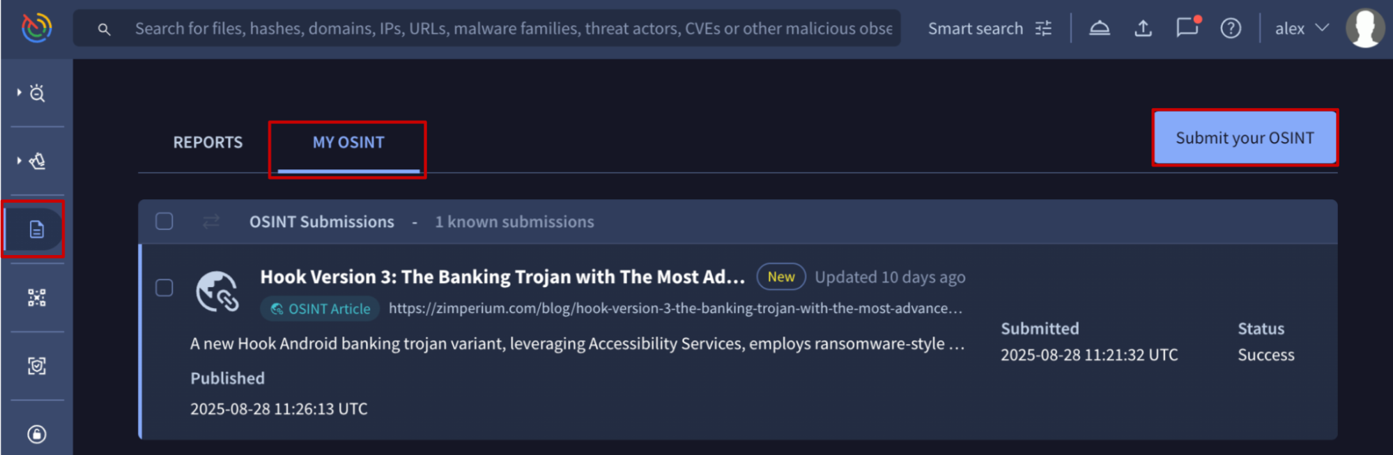 From the Reports & Analysis list view, you can submit an OSINT article for ingestion by clicking the Submit your OSINT button. This is useful for requesting reports that haven't been processed or included in our dataset yet, likely because the blog has not been added to our trusted sources yet.