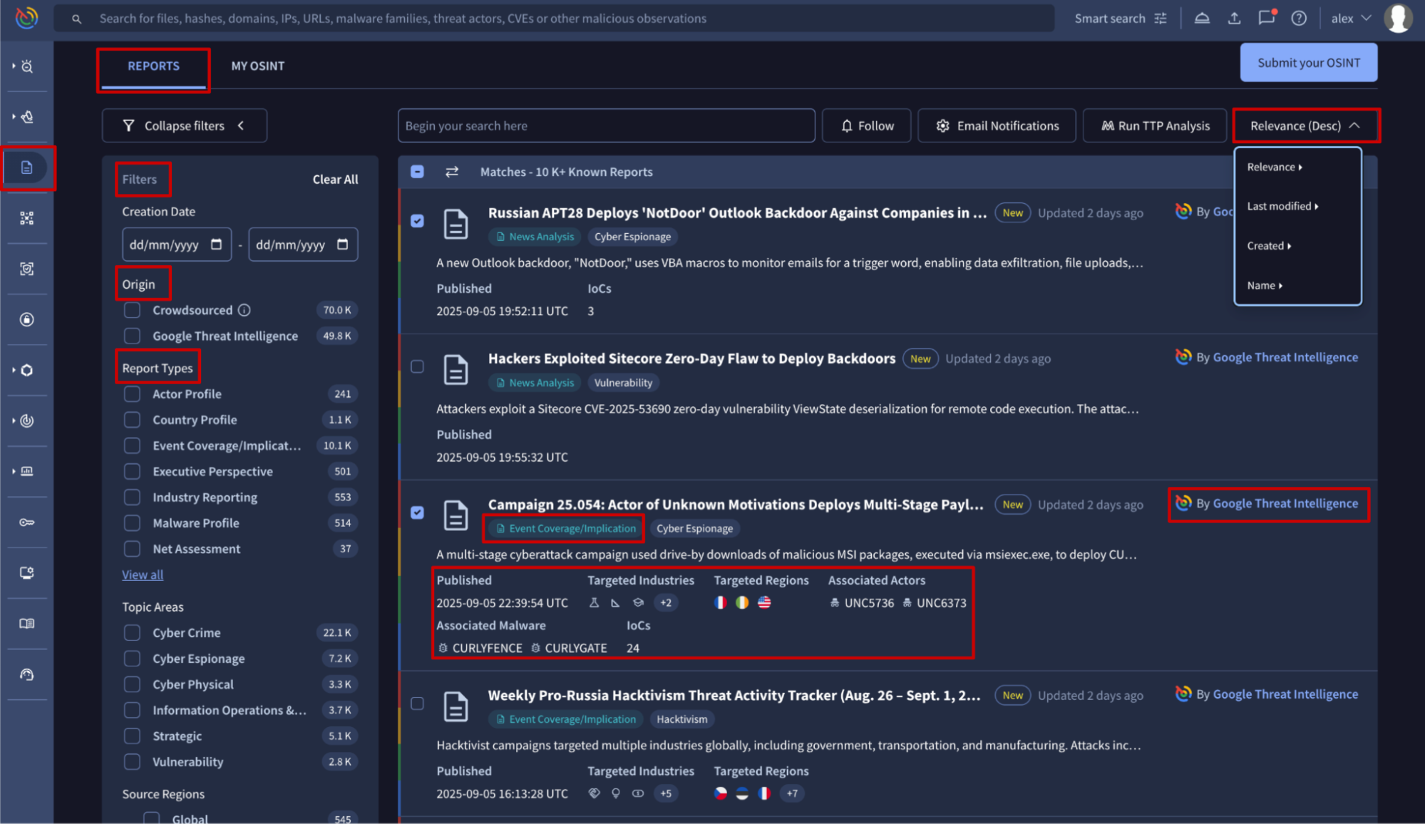 - Origin: filters by reports curated by Google Threat Intelligence analysts or those that are Crowdsourced from our community.
