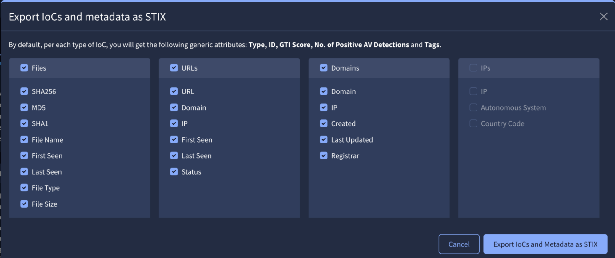 - click on the Download dropdown to either download the report as a PDF file or export its linked IoCs (if any) in JSON, CSV or STIX format file. If you choose to download IoCs and their metadata, a prompt will appear before the download begins, asking you to select the specific attributes you want to include in the exported file.