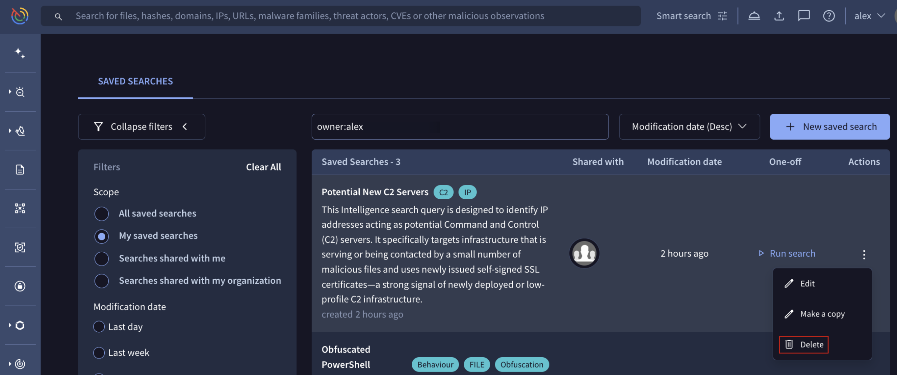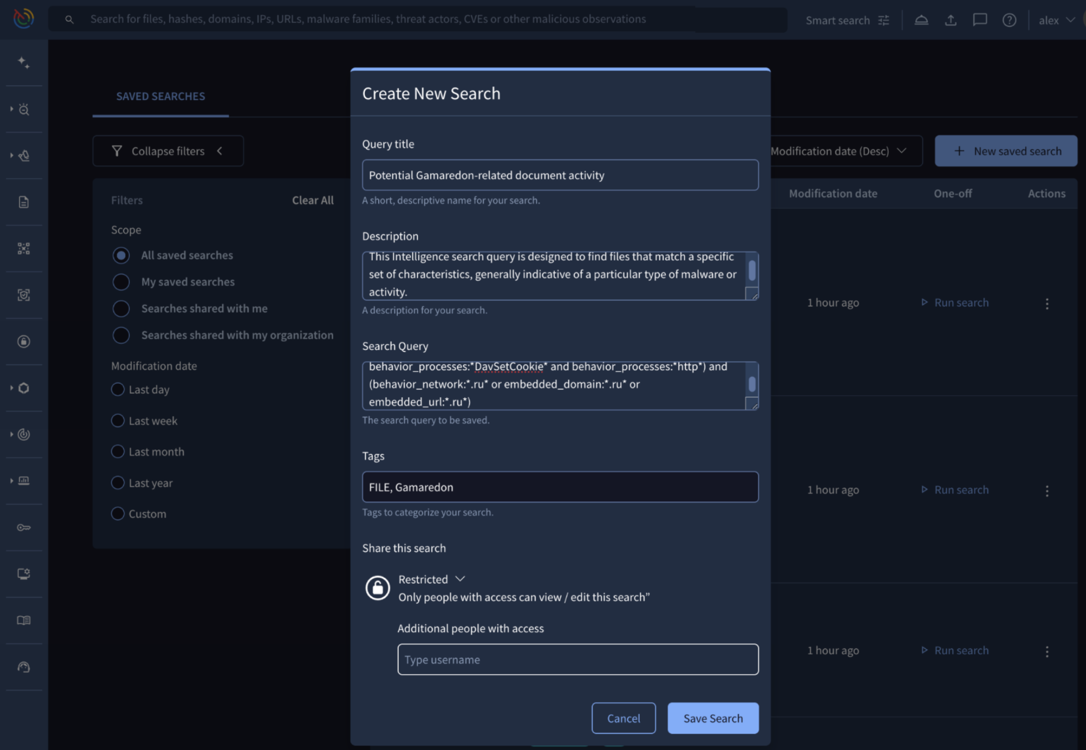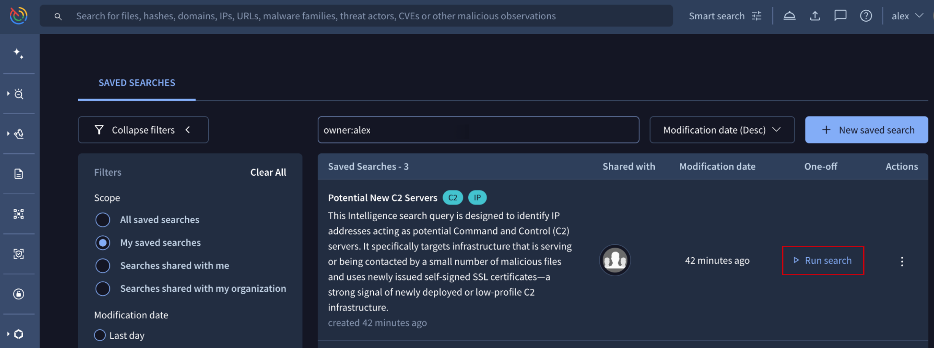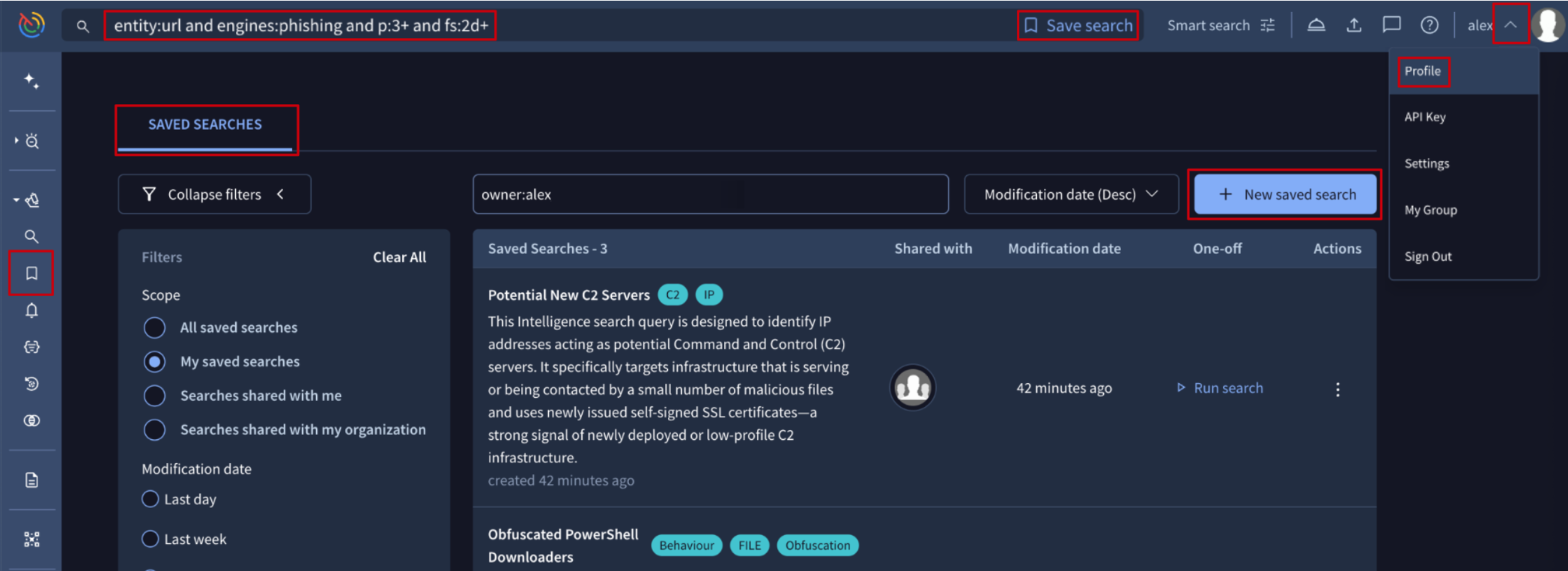 The Saved Searches feature is designed to empower users to efficiently store and reuse complex or frequently executed threat intelligence searches across our vast database of IoC analysis reports (files, URLs, domains, IP addresses).