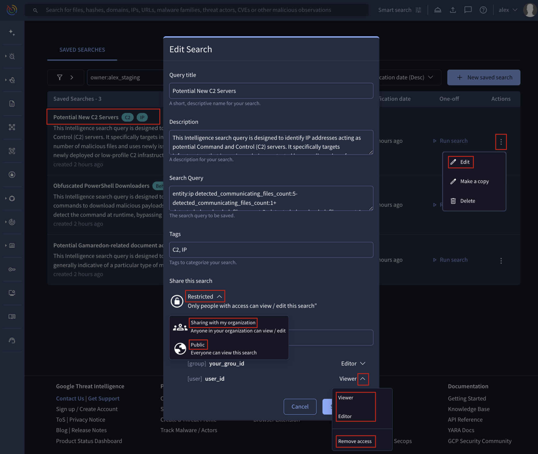 Note that editor privileges can only be granted to members belonging to the same group or organization as the owner of the saved search.