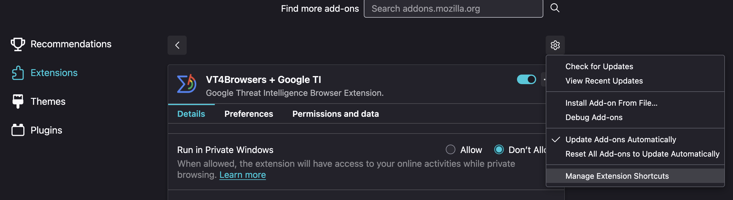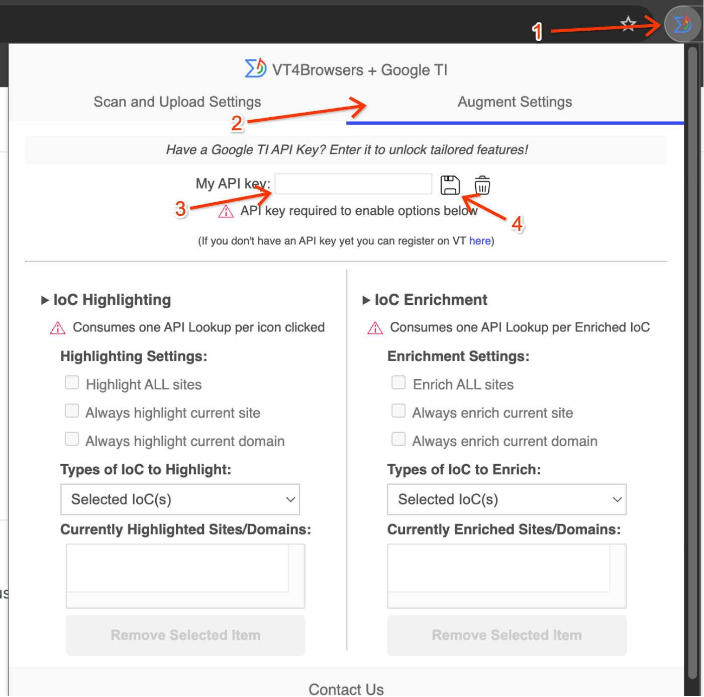 If you do not have a valid Google Threat Intelligence (GTI) API key, please refer to the general VT4Browsers documentation for the correct setup instructions.