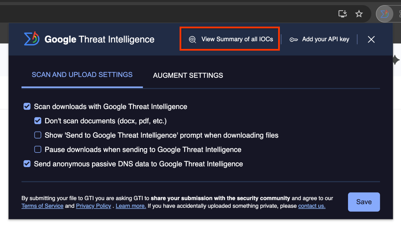 Live Investigation: As you navigate the web and encounter Indicators of Compromise (IOCs), the extension leverages your Google TI permissions to automatically highlight/enrich the page.
