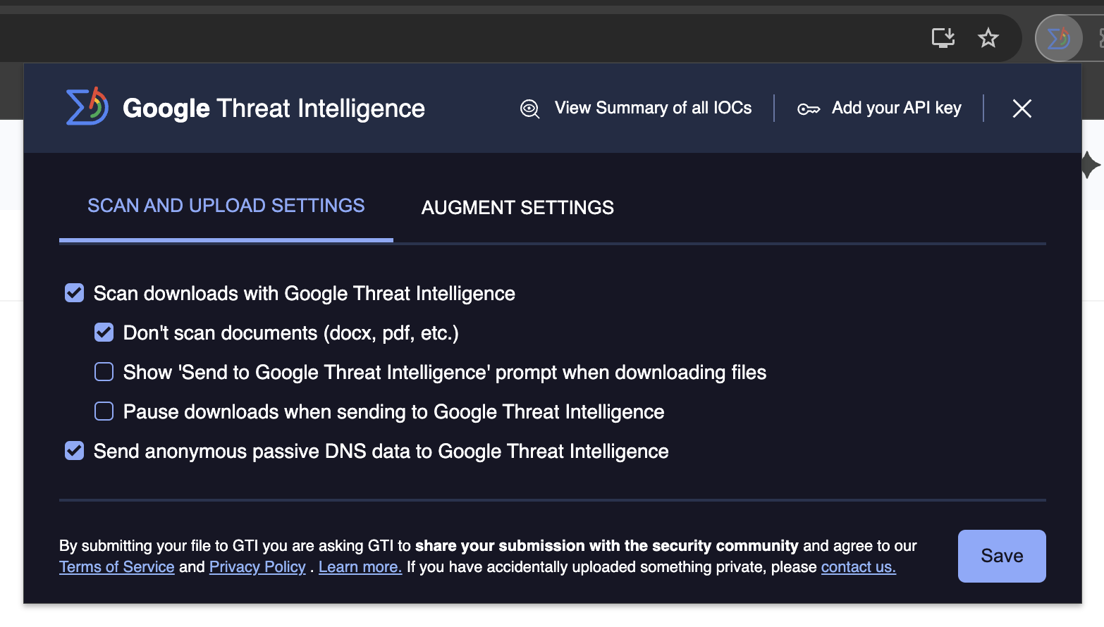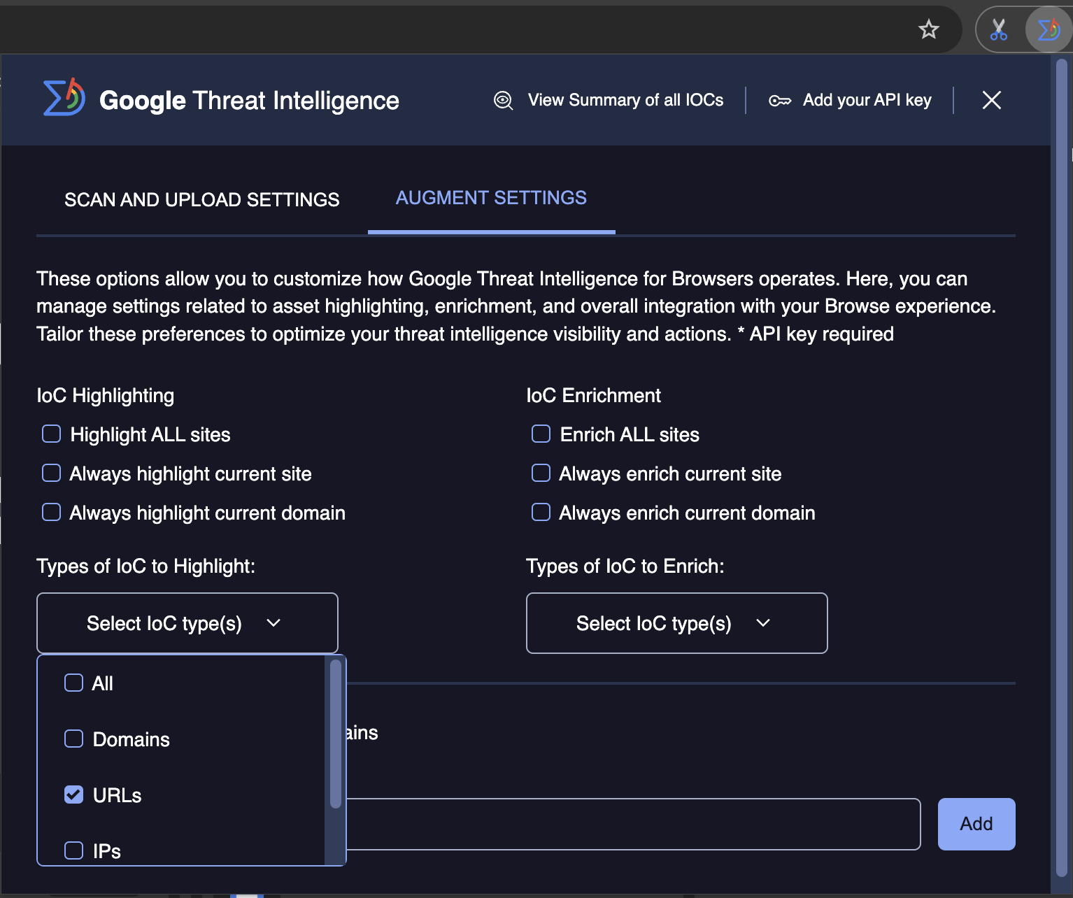 The second settings tab contains the options for the GTI AUGMENT widget integration. This functionality automatically identifies IoCs (hashes, domains, IPs and URLs) in websites of your choice and incorporates Google Threat Intelligence reputation and threat context in a single pane of glass fashion.