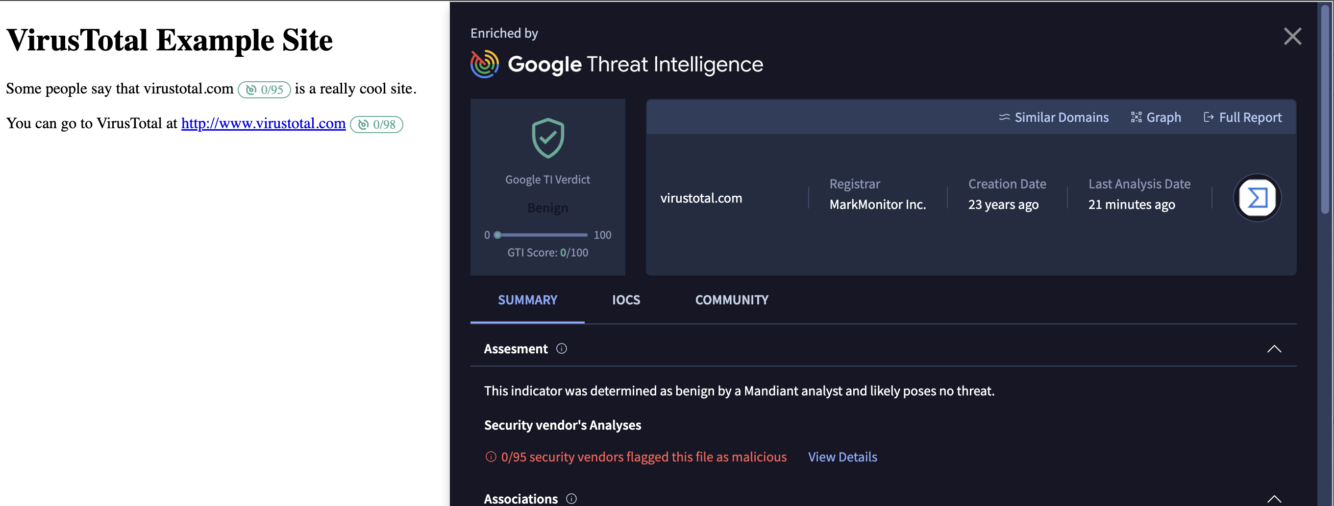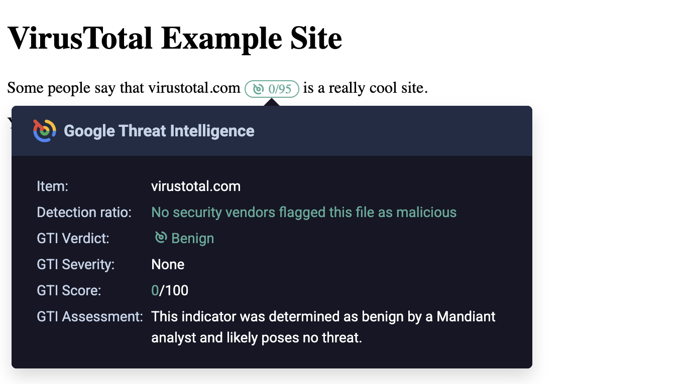- Action on Page Load: VT4Browsers identifies all IoCs on the page and simply adds a small Google TI icon right next to each IoC.