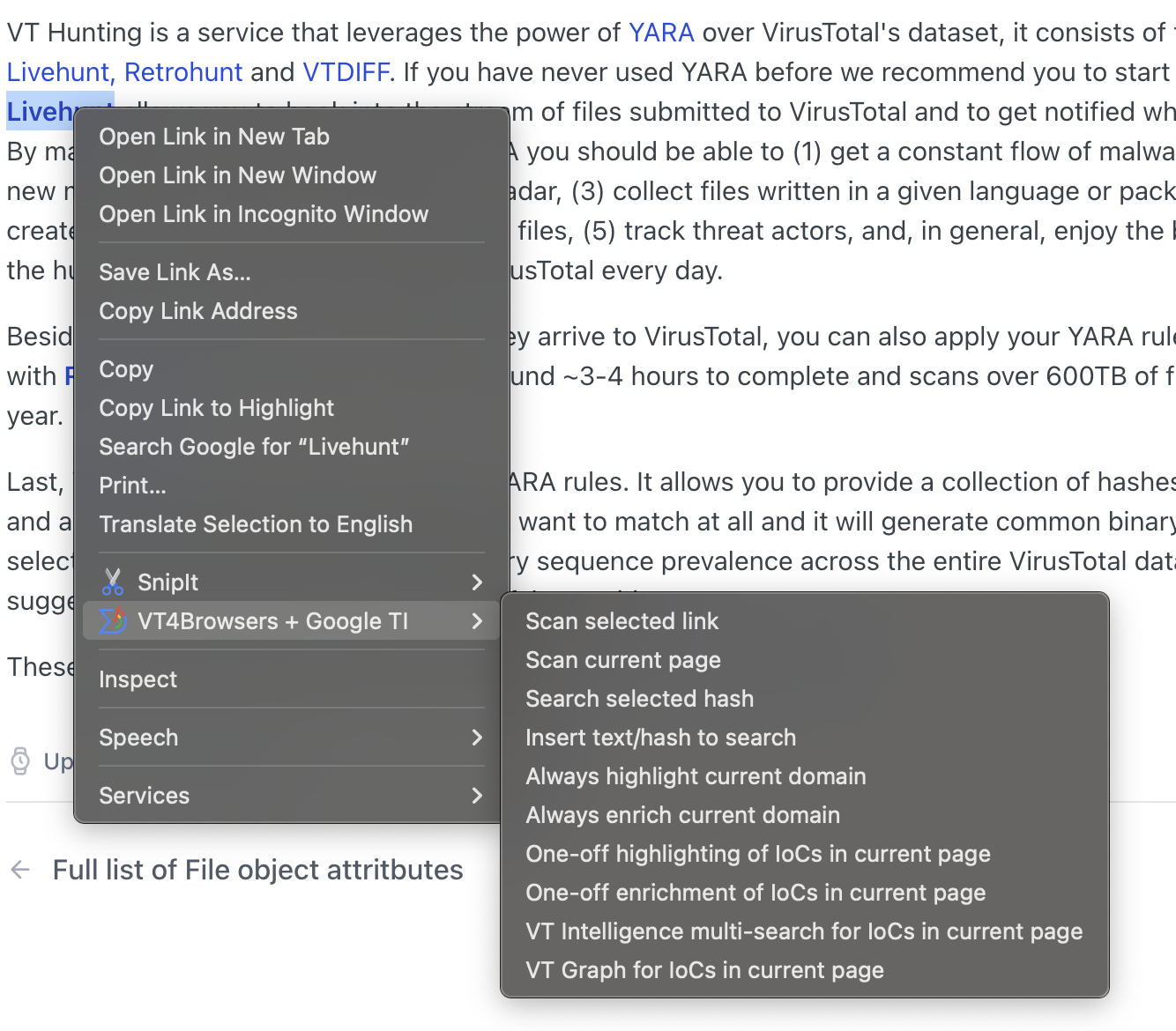 - VT Intelligence multi-search for IoCs in current page: This option will automatically identify any IoCs (hashes, domains, IPs, URLs) in the website being viewed and will launch a VT Intelligence search for those in a new tab.