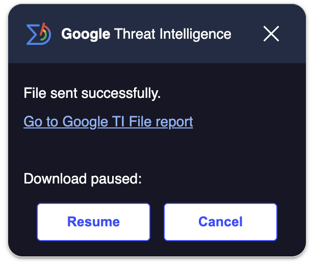 With the option to pause downloads you can even choose to resume or cancel your downloads after checking their Google Threat Intelligence report:
